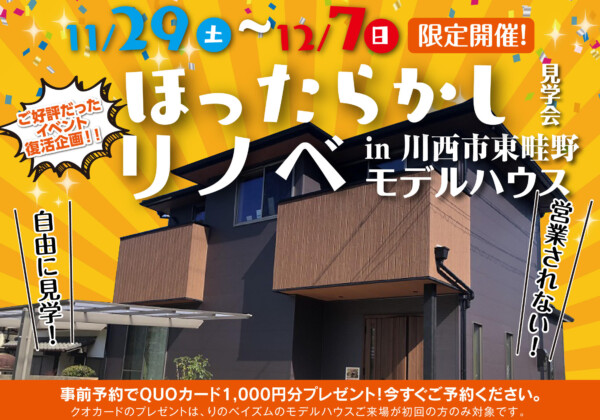 11/29(土)〜12/7(日)、東畦野で大好評のりのべイズムのほったらかし見学会が再び開催!自由に見学できてQUOカード1000円分プレゼントも!