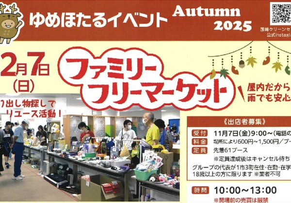 12/7(日)、国崎クリーンセンターゆめほたるでファミリーフリーマーケットが開催されるみたい。