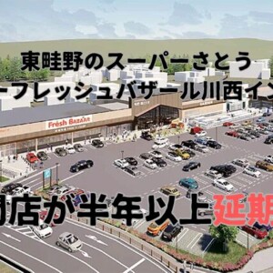 東畦野で工事中のスーパーさとう(スーパーフレッシュバザール川西インター店(仮称))の開店が大幅に遅れるみたい。