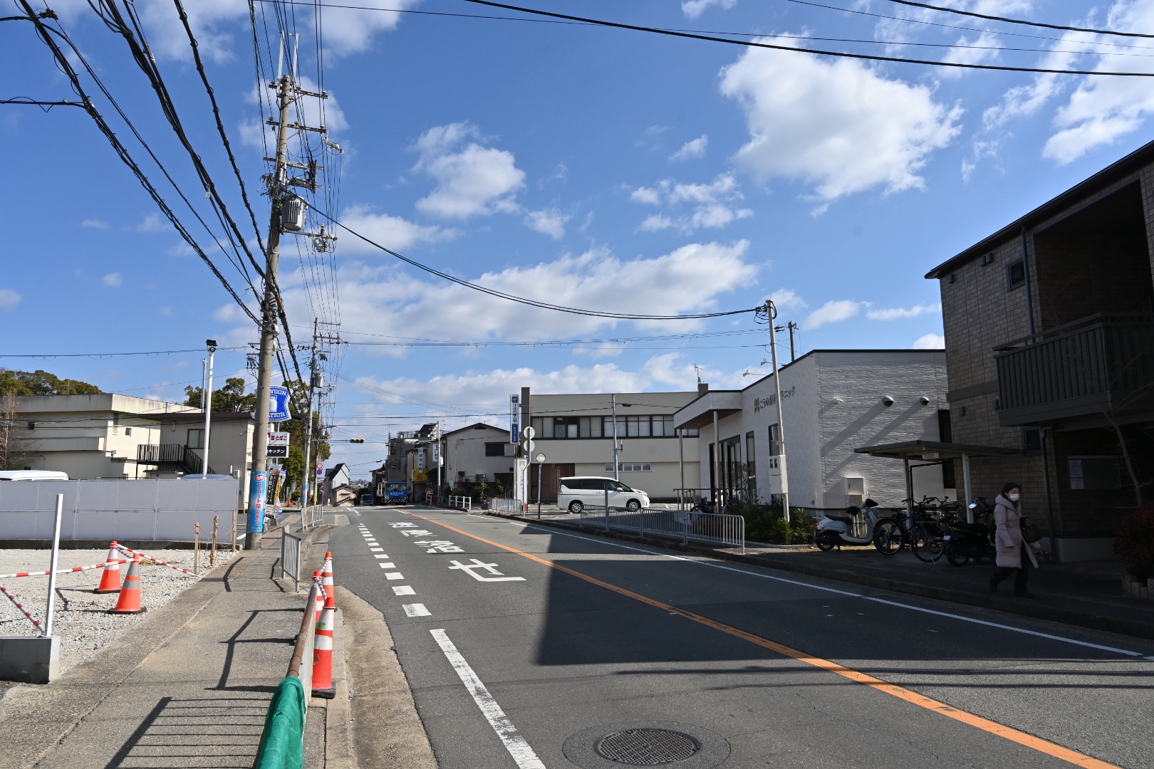 現在はカラーコーンが置いてあり、奥には看板が設置工事中。