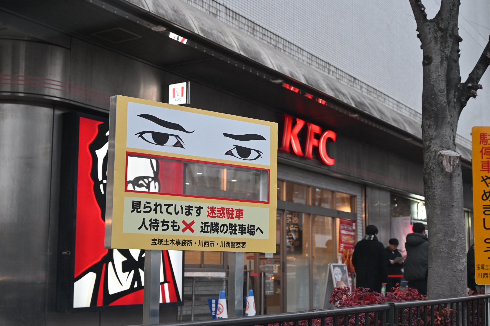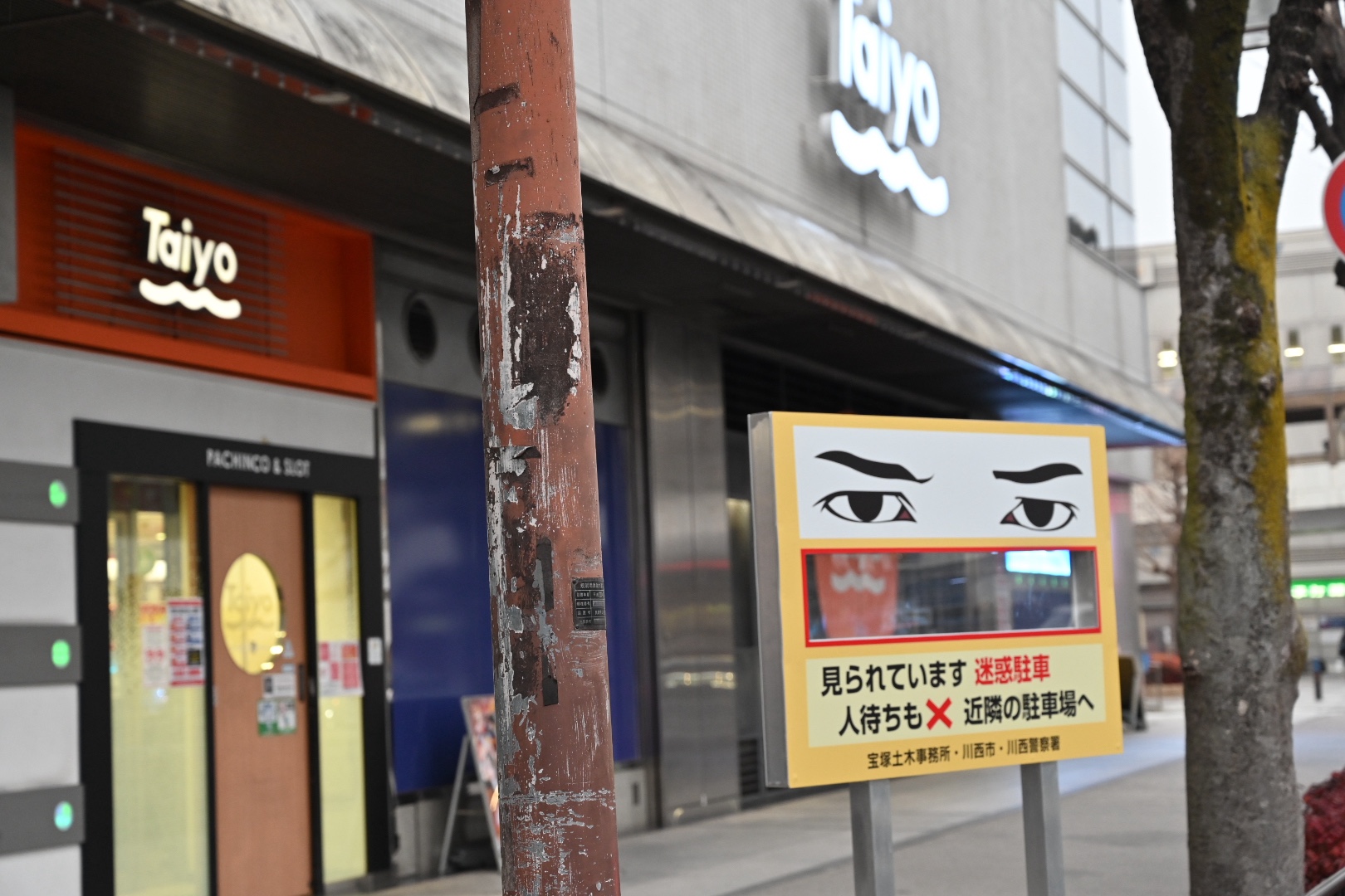 川西能勢口駅前にちょっとクセのある迷惑駐車ダメよ看板ができてる。
