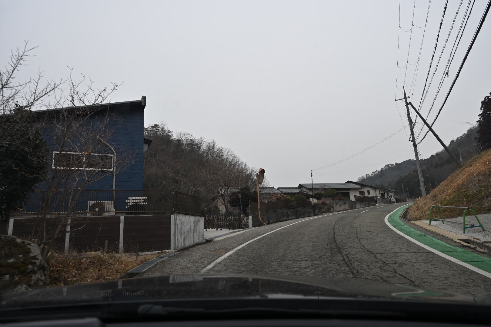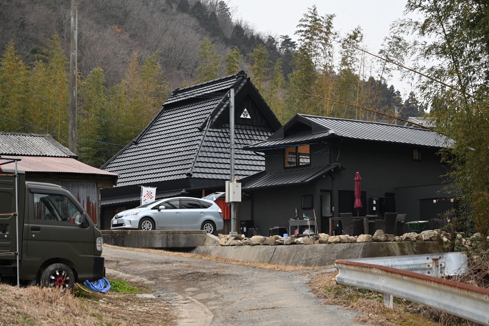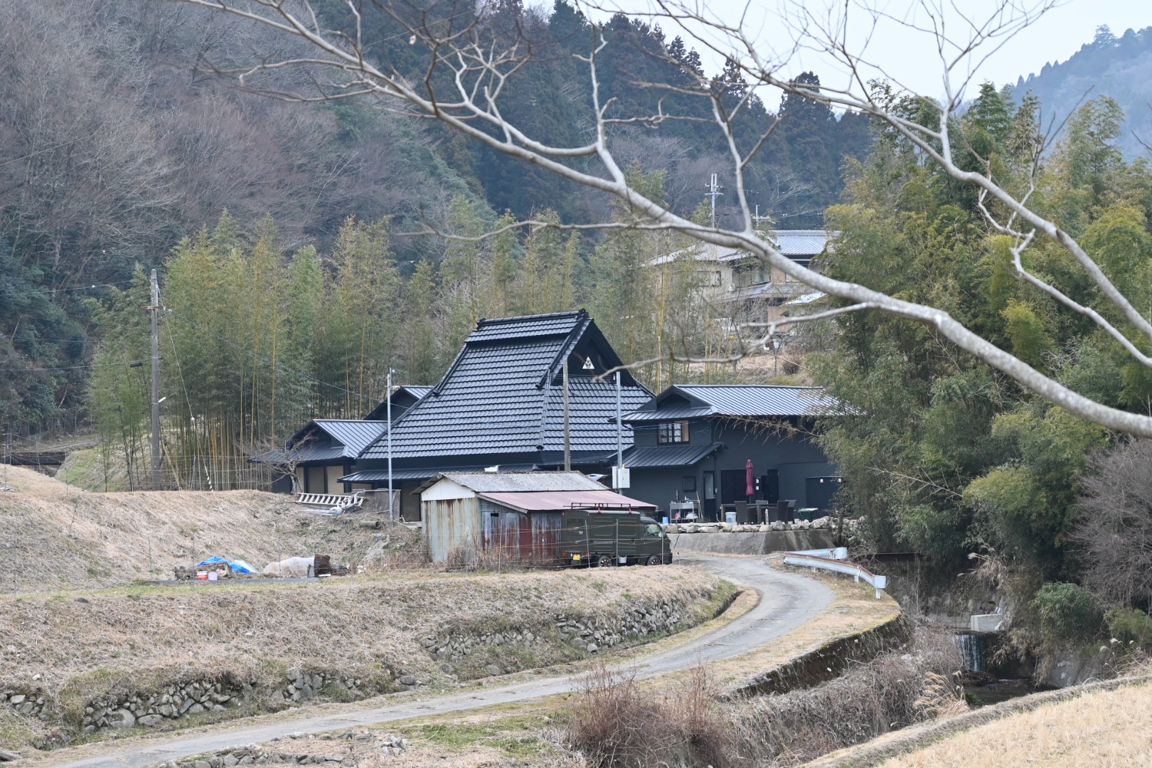 道の左手に見える古民家が目的の星の宿 彩音-SAINEH-。