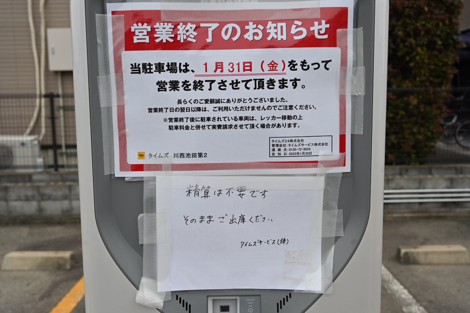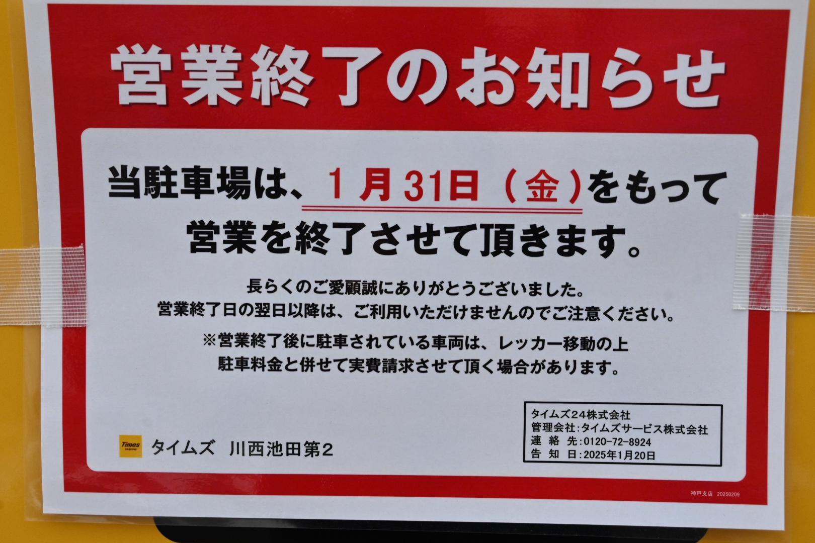 JR川西池田駅南側のタイムズ川西池田第2が1/31(金)で閉鎖したみたい。