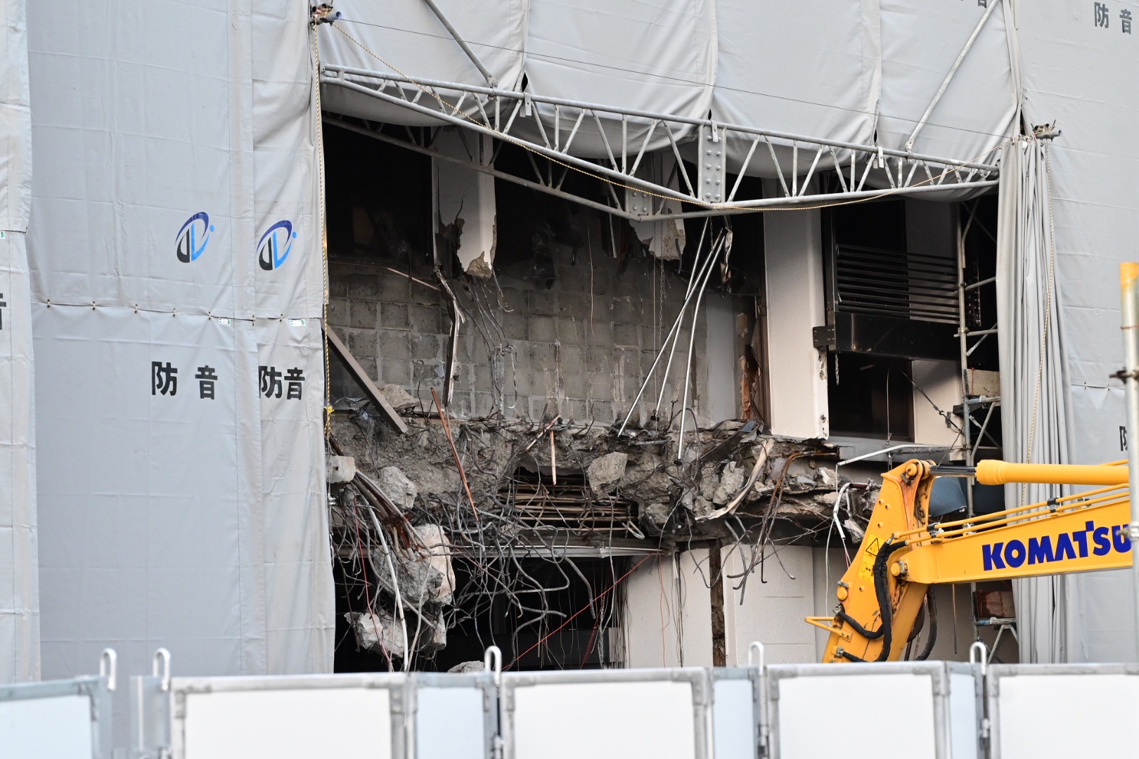 解体工事がちょっと進んでいるみたいで、1階入口の自動ドアのあった箇所の上がこんな状態になっています。