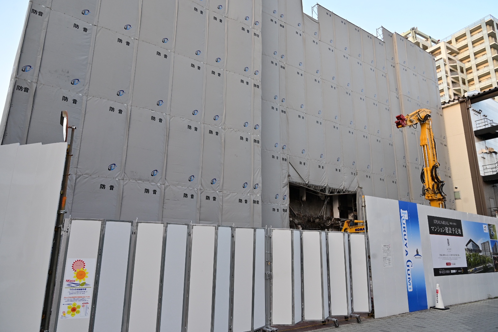 西友川西店跡地のマンション工事の看板が新しくなってる。そして、西友の解体の様子がちょっと見えてる。