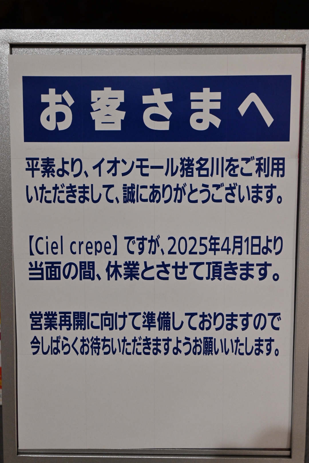 イオンモール猪名川3階のシエルクレープが4/1(火)から休業してる。