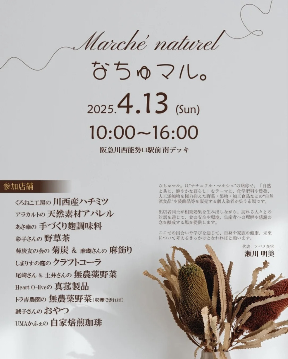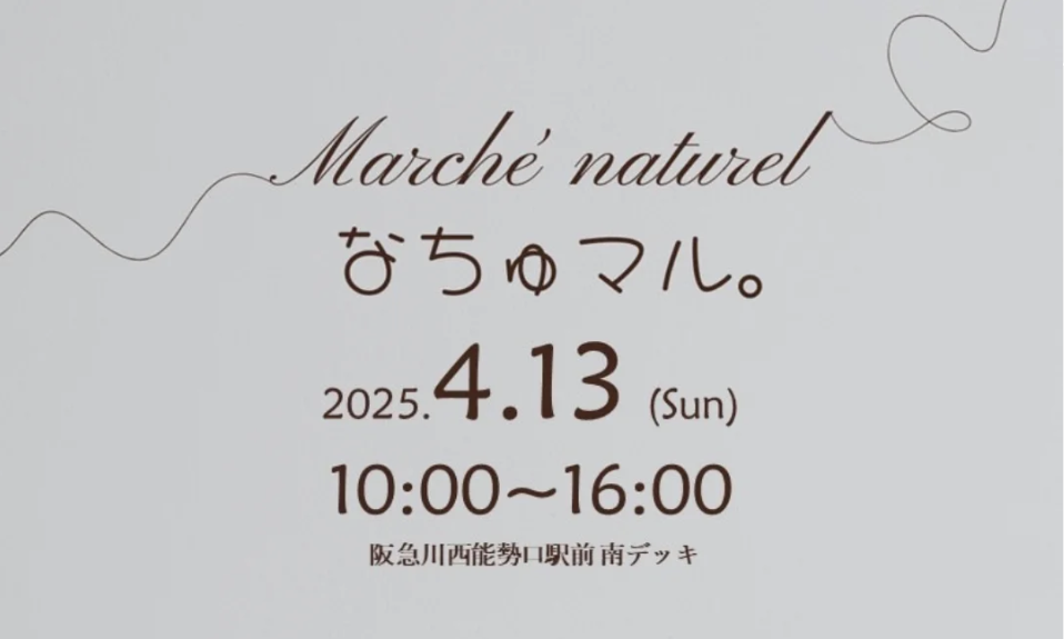 4/13(日)、川西能勢口駅南デッキで、なちゅまる。っていう自然派の食品・装飾品のイベントが開催されるようです!