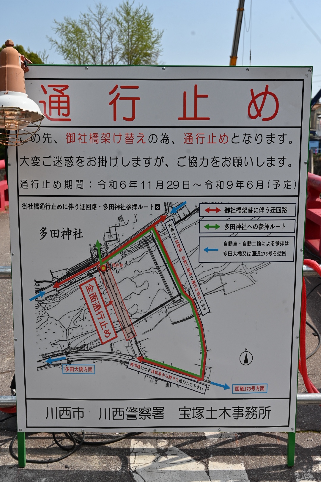 多田神社の真正面に位置する赤橋ですが、現在掛け替え工事中です。