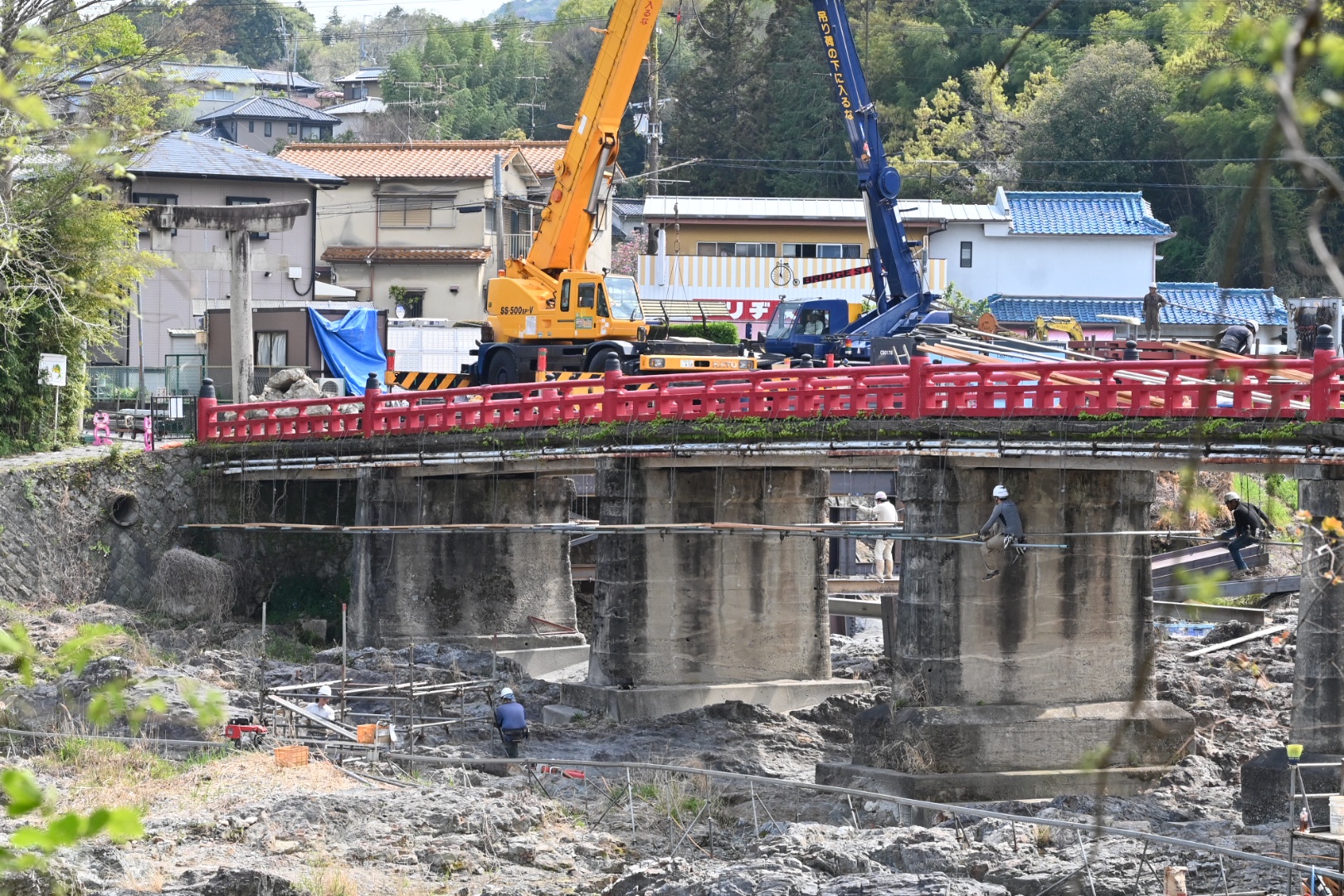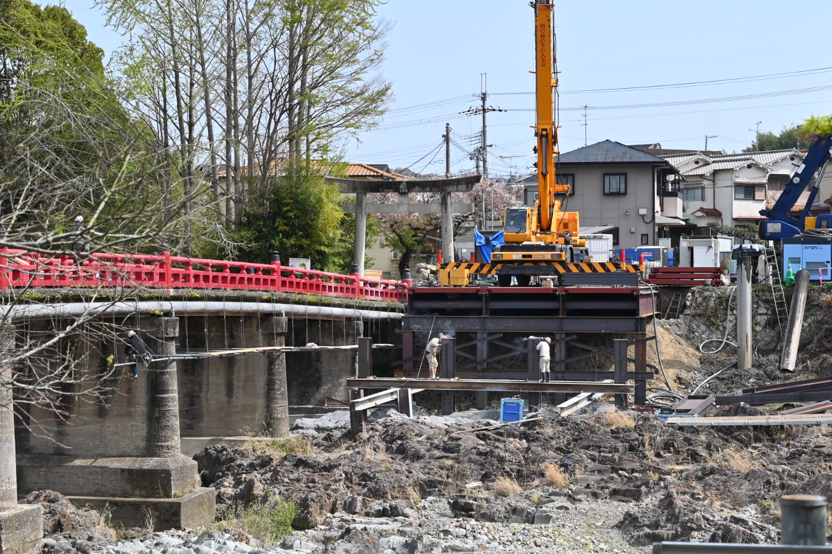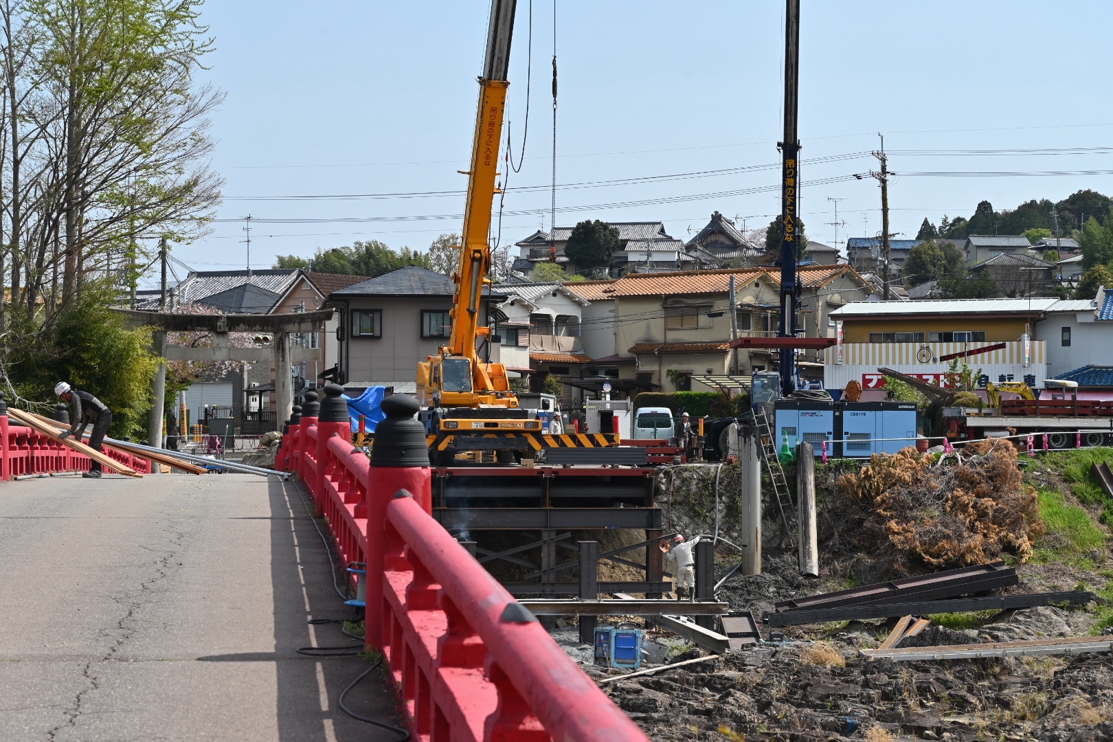 掛け替え中の多田神社前の赤橋の工事を見てきた