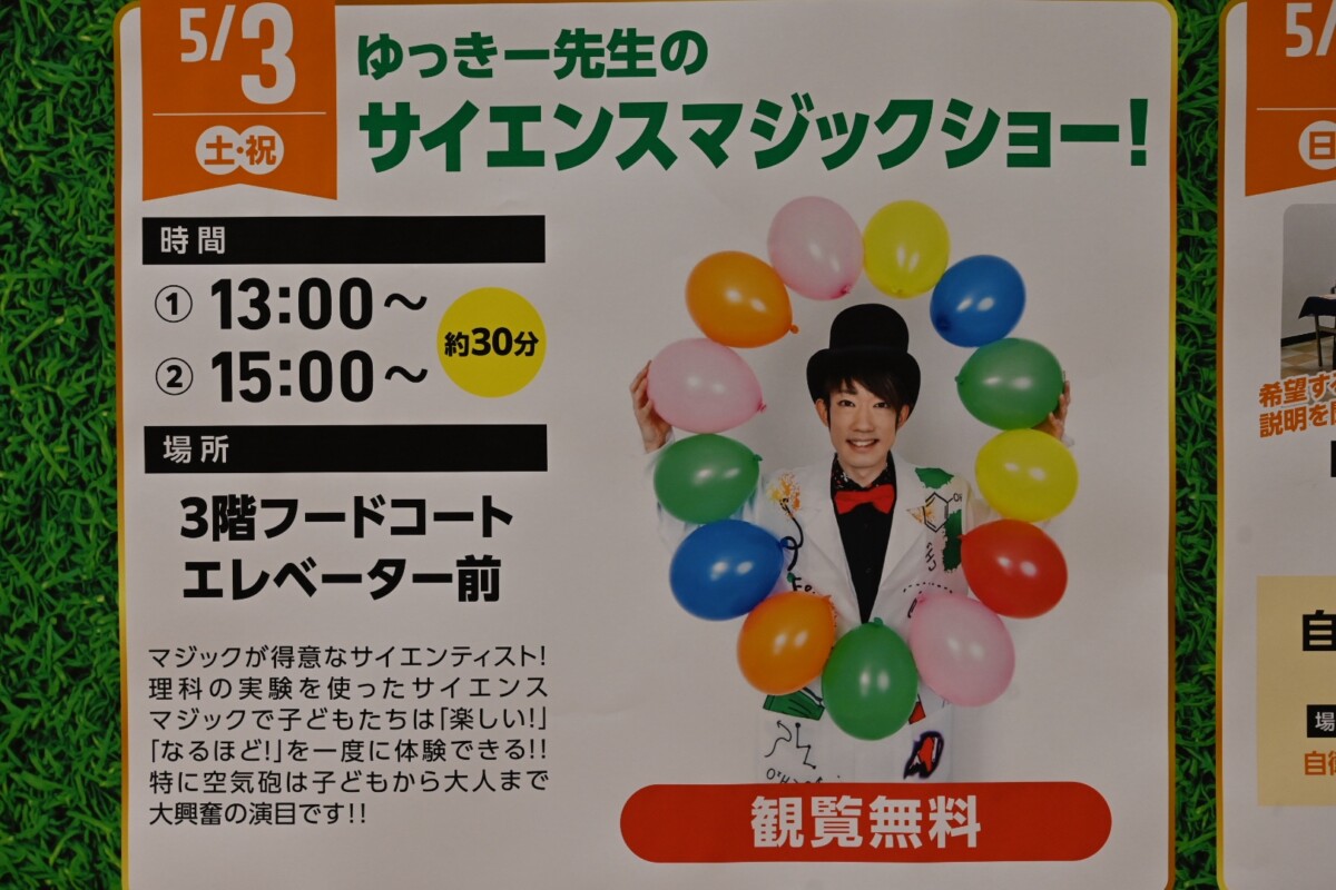5/3(土祝)、イオンモール猪名川3階フードコートエレベーター前で、ユッキー先生のサイエンスマジックショーが開催。