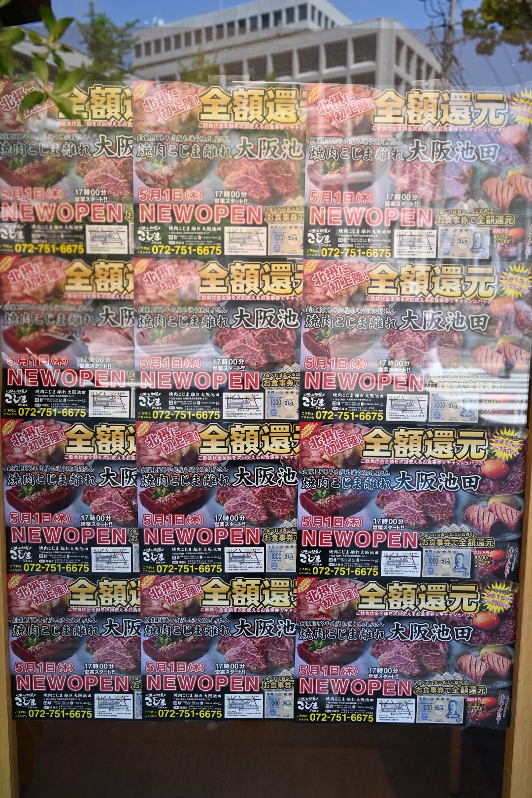 5/1(木)、池田駅前の「今日はラーメン。」のあった所に「焼肉こじま 離れ大阪池田」がオープンしたようです!