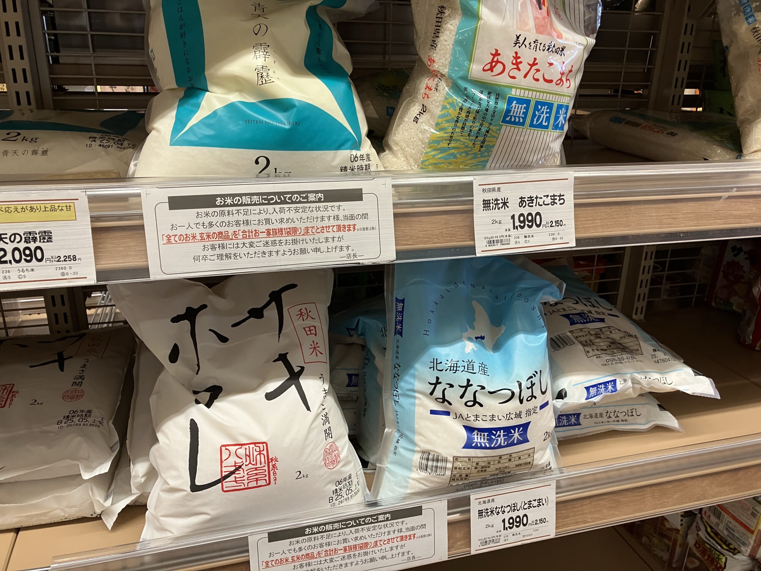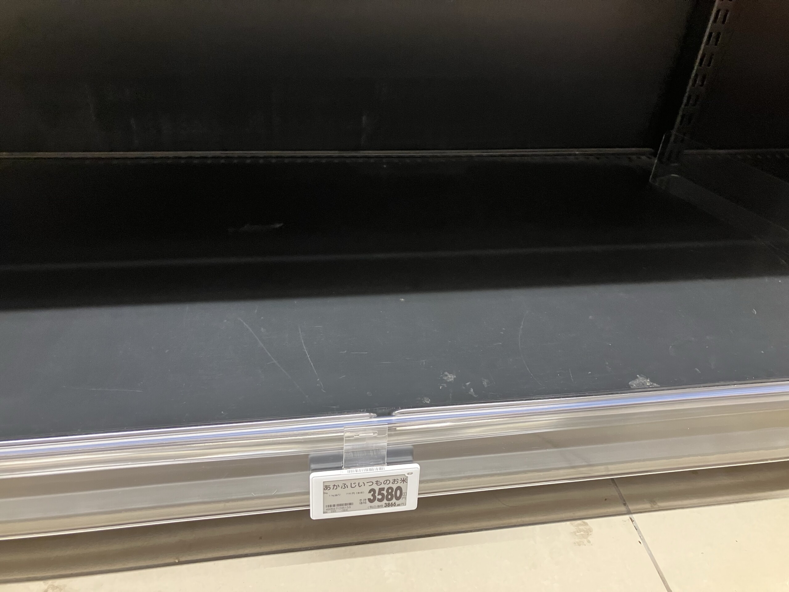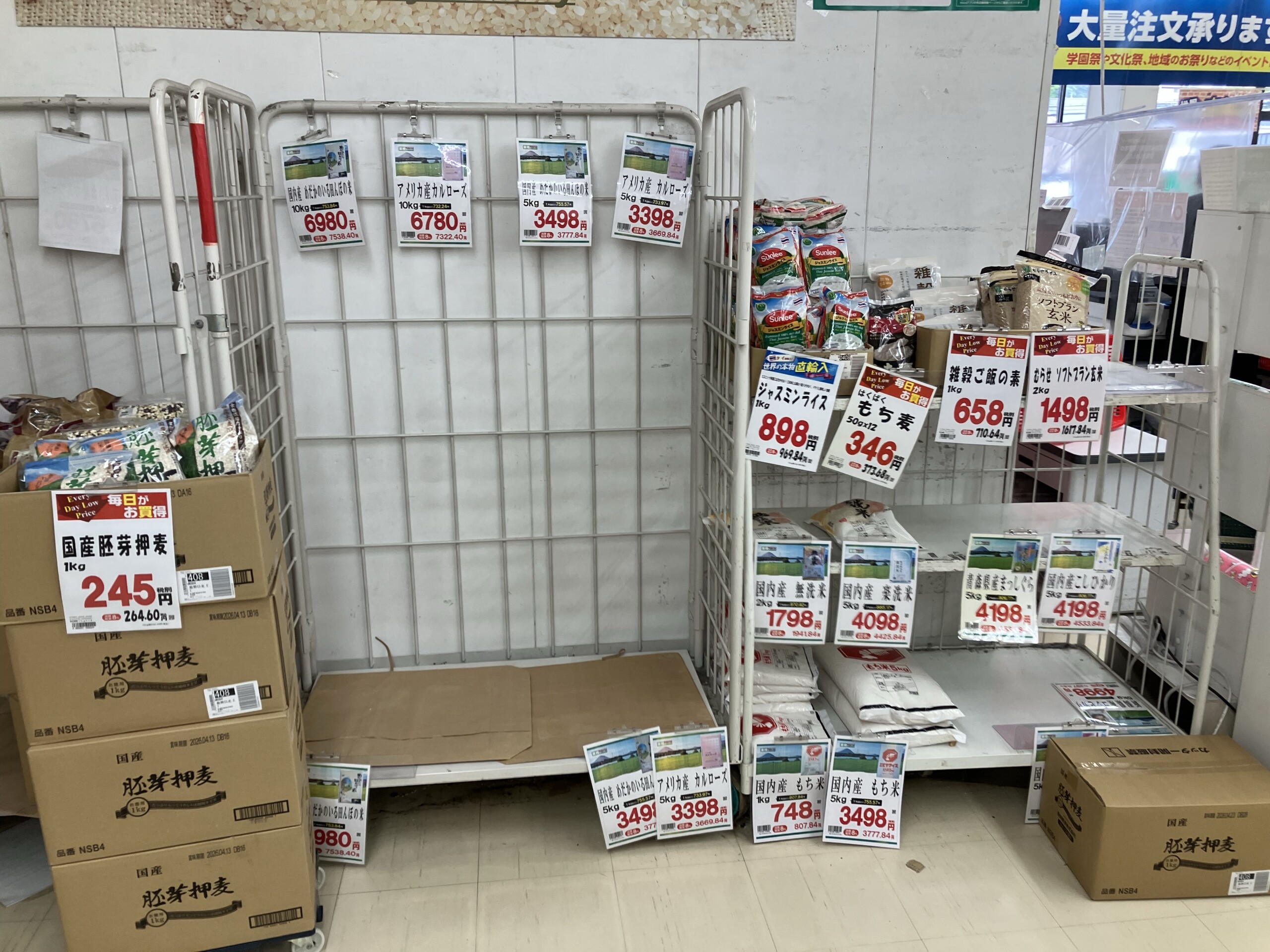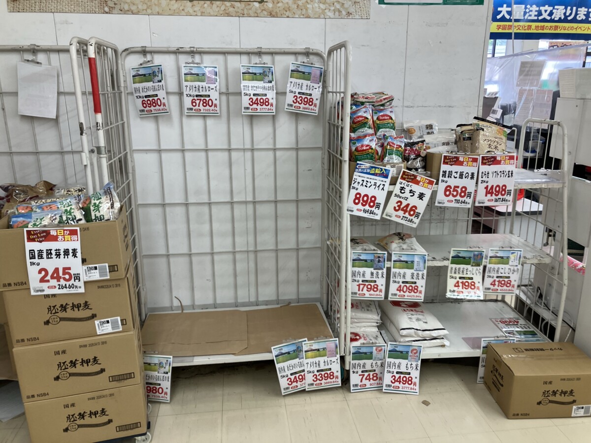 …が、店員さんによると、「お米の入荷自体がないのでお米コーナーもありません」というぶった斬りよう。