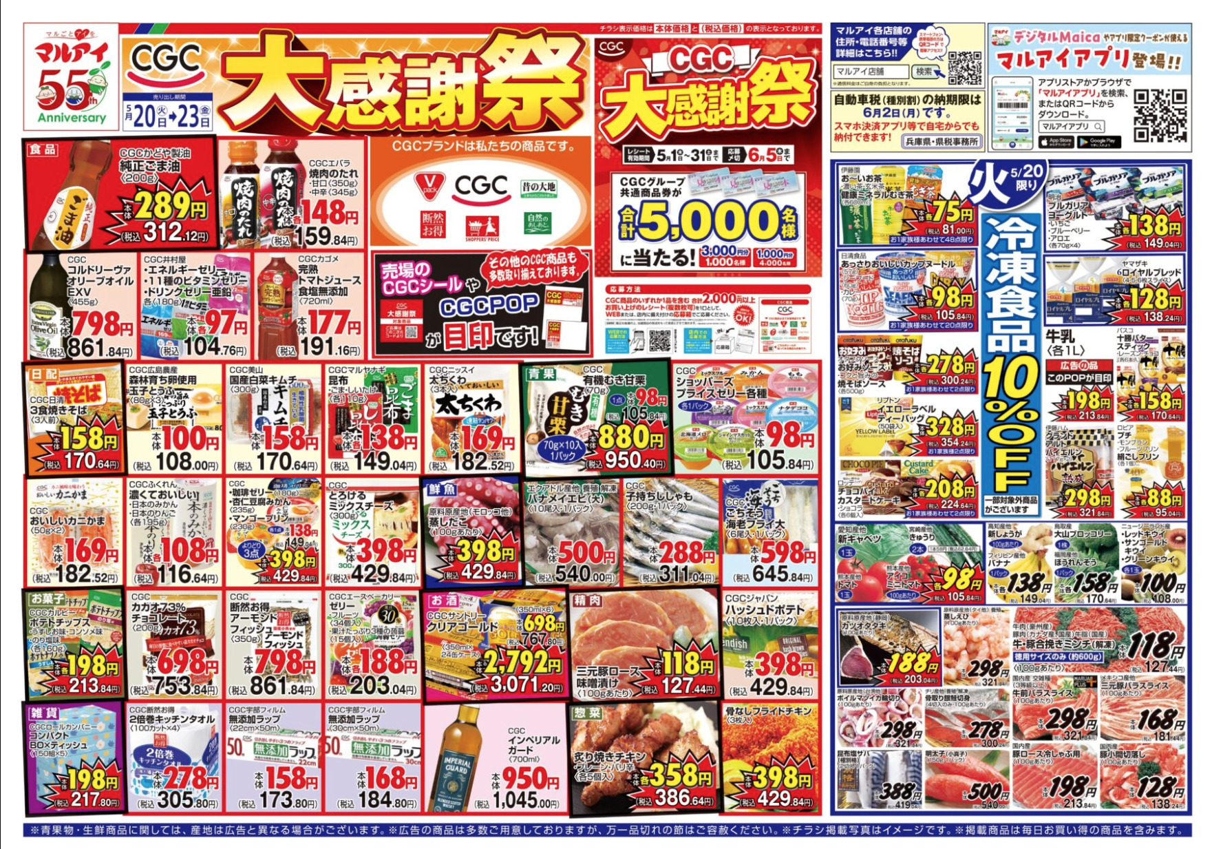 マルアイは兵庫県を中心に68店舗を展開する総合食品スーパーで、川西市近郊では、伊丹市中野に店舗があります。