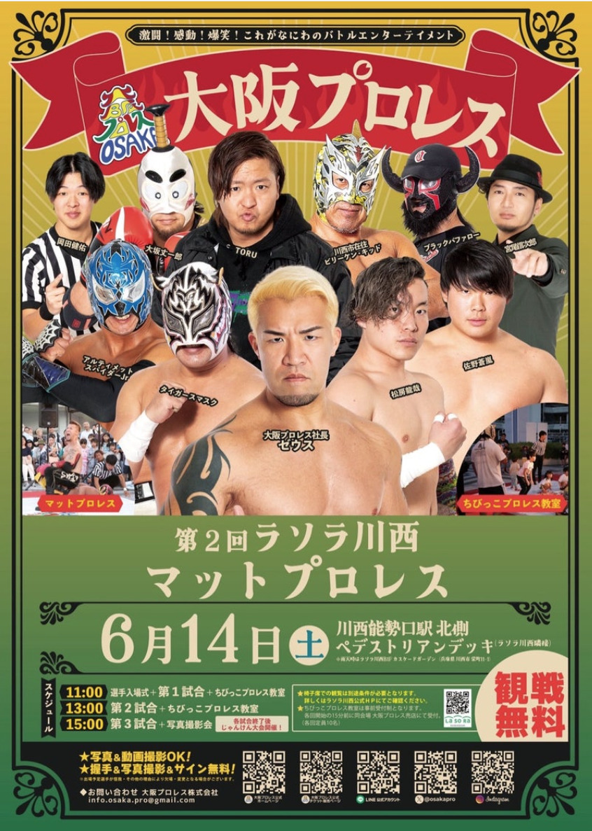 6/14(土)、大阪プロレス 第2回ラソラ川西マットプロレスが開催されるみたい。