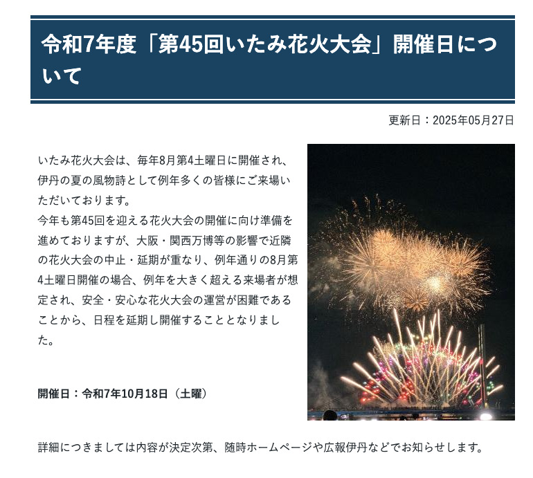 大阪・関西万博等の影響で近隣の花火大会の中止・延期が重なり、例年通りの8月第4土曜日開催の場合、例年を大きく超える来場者が想定され、安全・安心な花火大会の運営が困難であることから、日程を延期し開催することとなりました