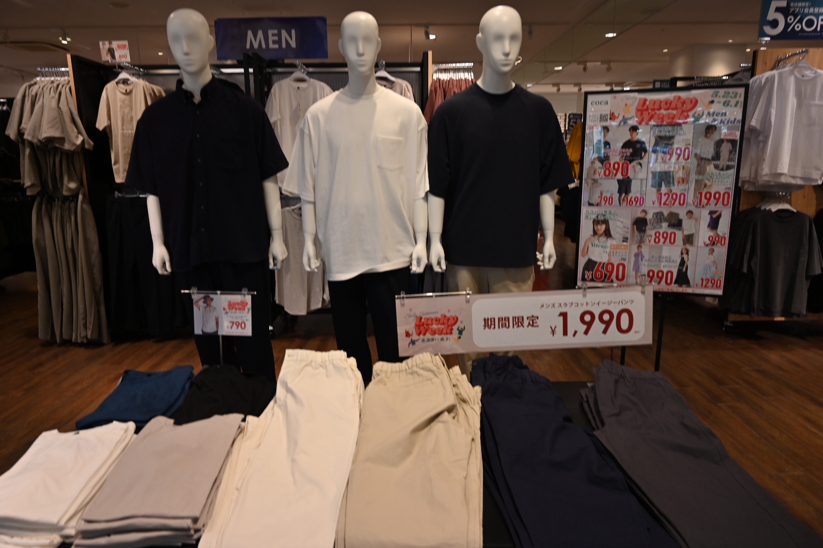 マネキンが着ているのは、ここ5年くらいずっとメインストリームの、シンプルなオーバーサイズのTシャツに、ストライプコットンイージーパンツ(¥1990)。
