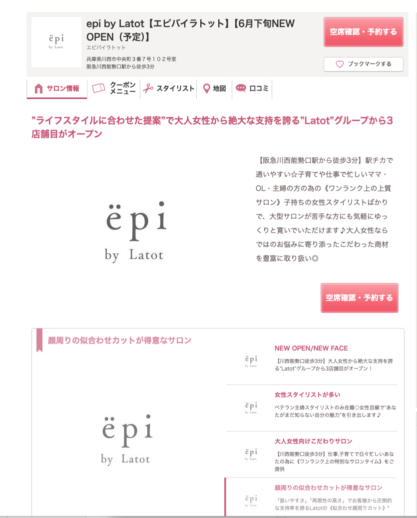 ホットペッパービューティによると、epi by Latot(エピバイラトット)が6月下旬にオープンするみたい。