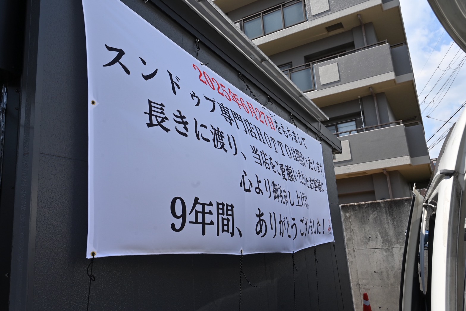 壁には6/27での閉店を告げる感謝のターポリンが掲げてあります。