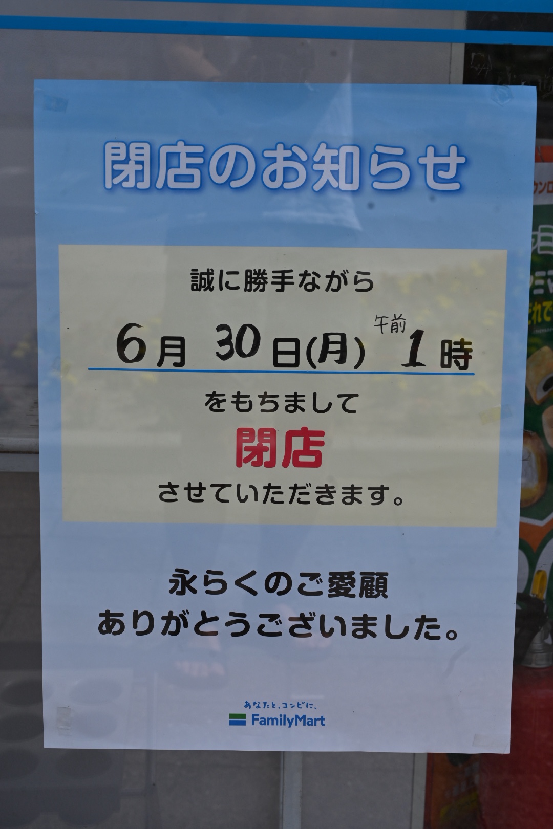 店頭には、6月30日(月)午前1時での閉店の告知がされています。