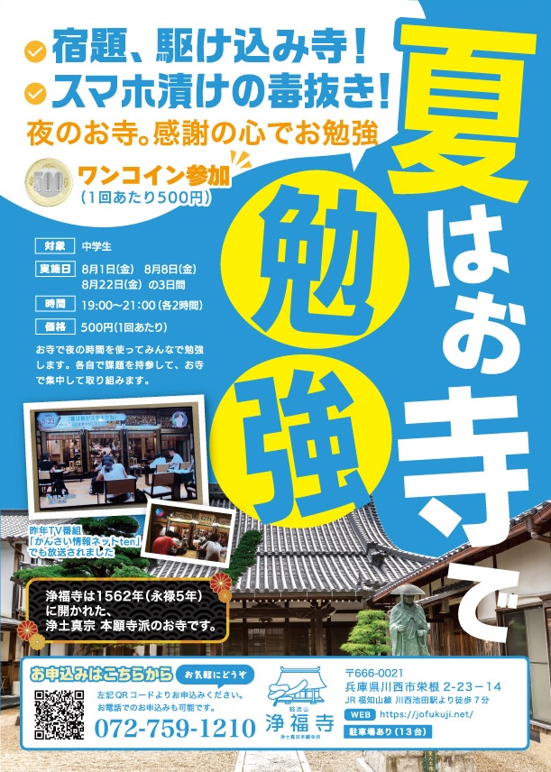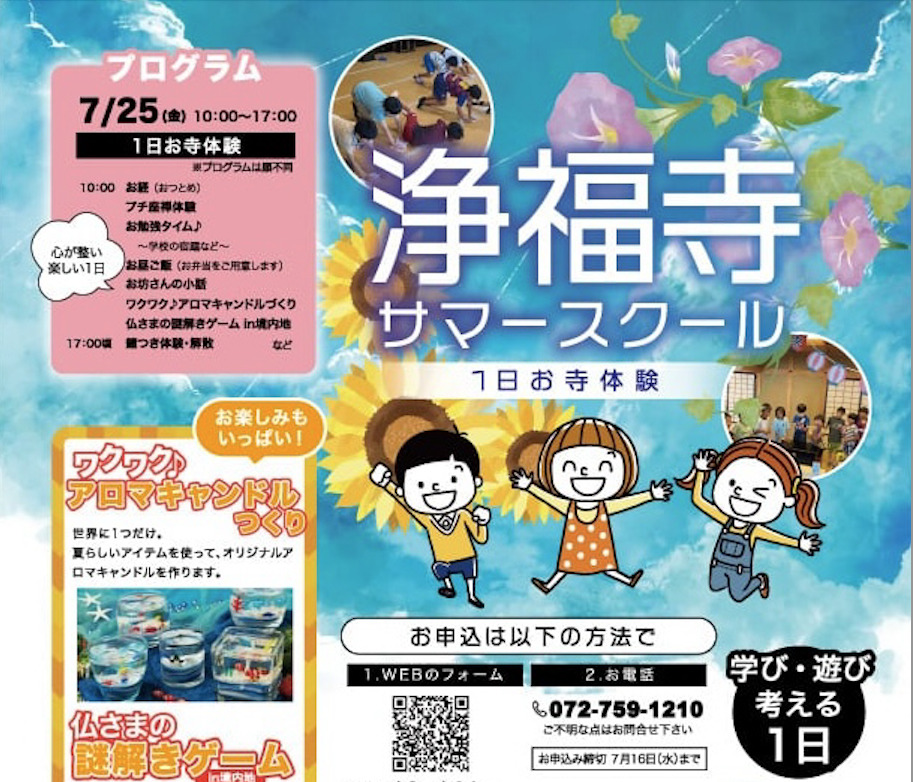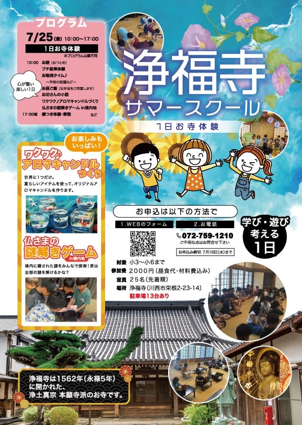 7/25(金)、川西市栄根にある浄福寺で「浄福寺サマースクール」が開催されるようです!