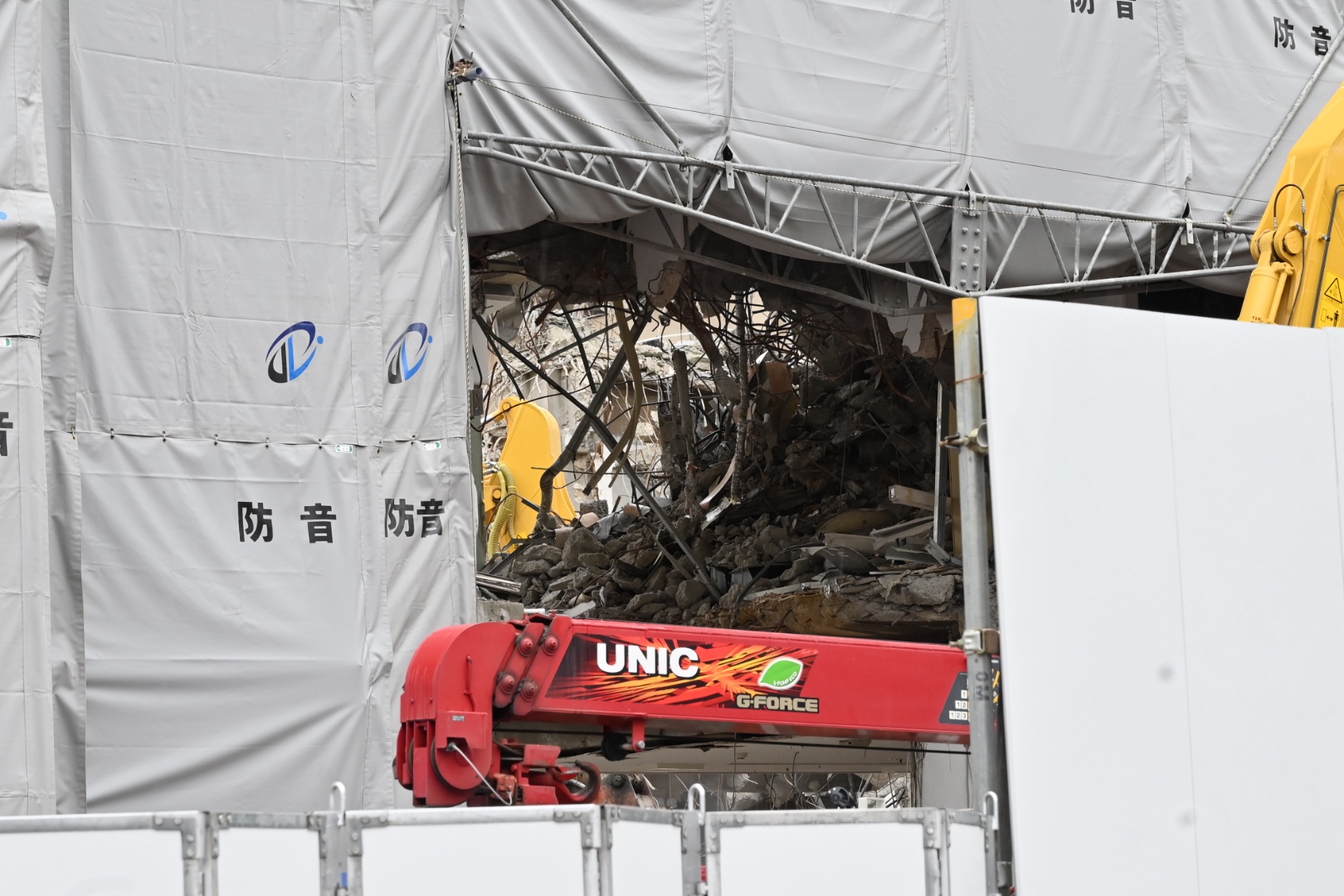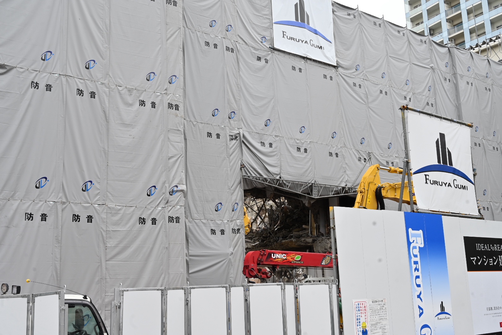 そして防音シートの向こうに見える建物の瓦礫の向こうに重機が見えます。