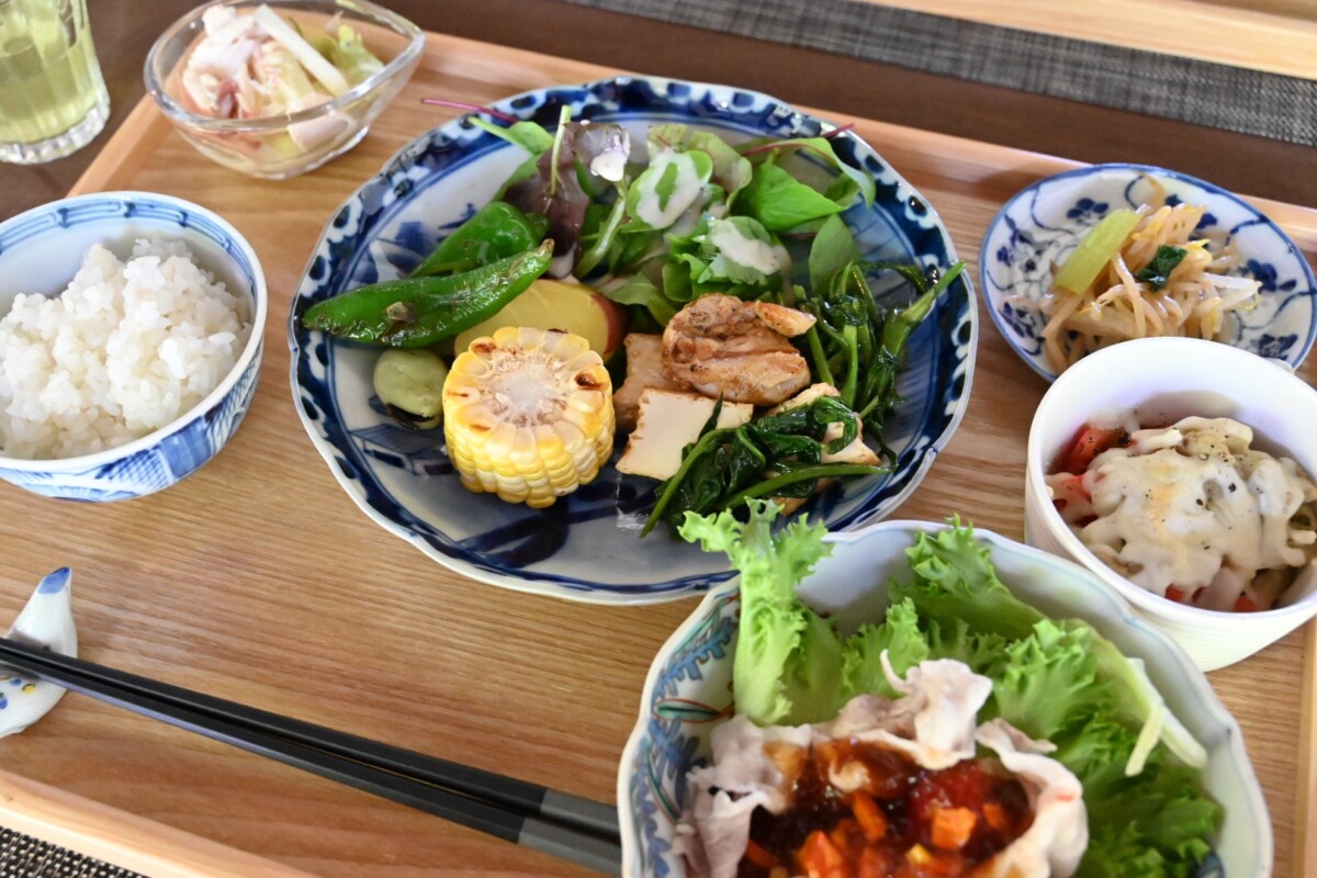 こちらはとうもろこし、青唐辛子、さつまいも、そら豆、空芯菜、厚揚げとほうれん草?、鶏肉タンドリー風?、シーザーサラダなどの焼き物。