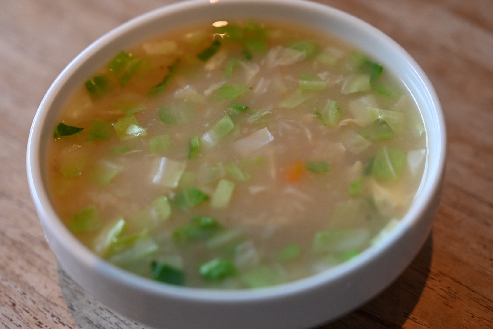 こちらのスープはにんじん、卵、レタスなどが入っていて、とろみがあってちょっと中華風な味わいで、鶏ガラスープかな?