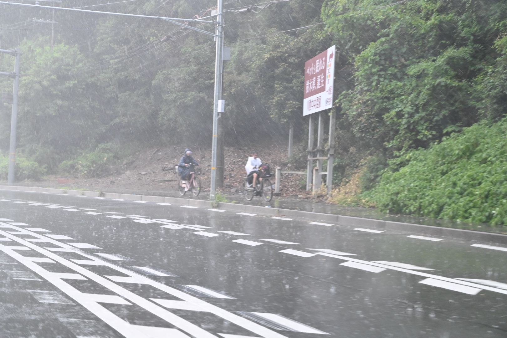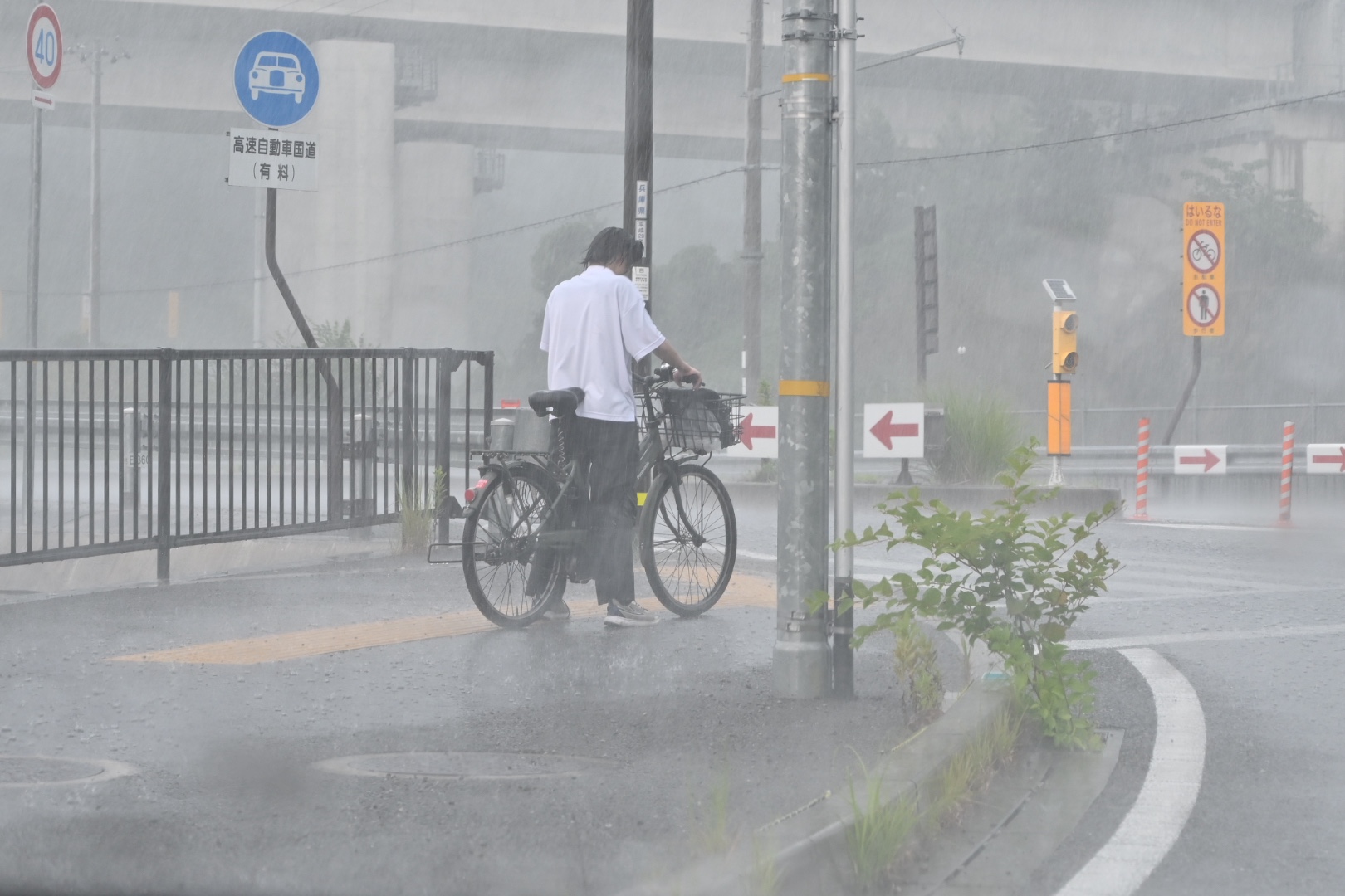 ふと歩道に目をやると、ずぶ濡れになった自転車の高校生。