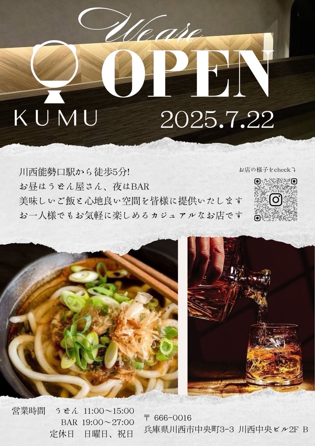 • 川西市中央町にあった旬彩なのはなが閉店して、その後にKUMUっていうお昼はうどん屋さん、夜はBARになるお店が7/22にできるみたい。