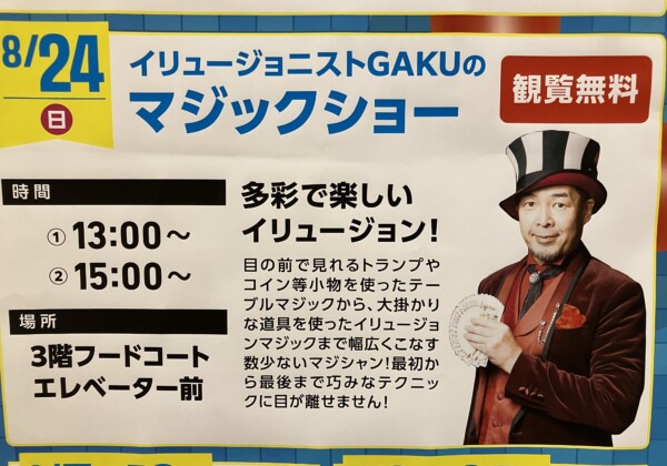 どうも、かわマガ@けいたろうです! 猪名川町のイベント情報です! 8月24日(日)、イオンモール猪名川で、イリュージョニストGA...