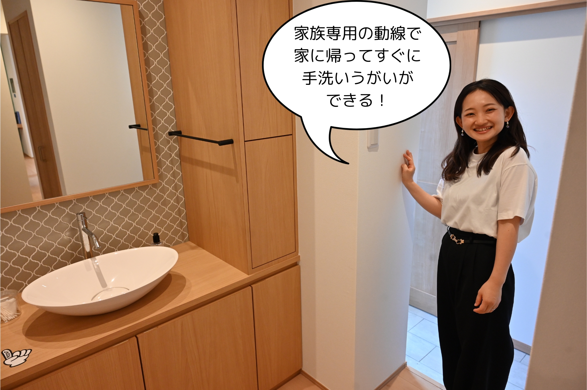 更にその奥へ入るとそこには洗面があって、すぐに手洗いやうがいを済ませてお家の中に入れるようになっています。