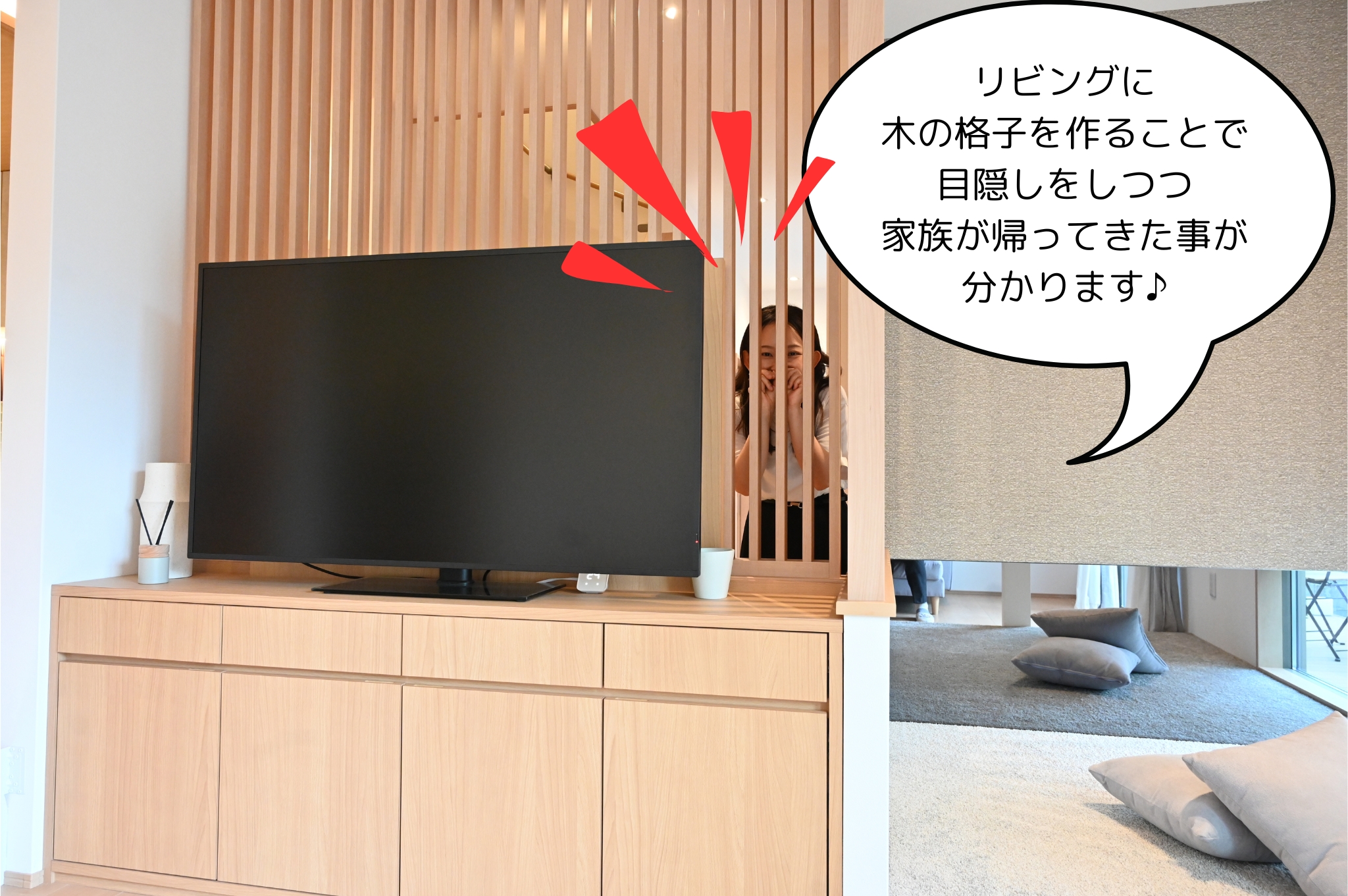 店舗デザインをやっているデザイン力はあちこちに活かされていて、たとえばリビングのこの格子。