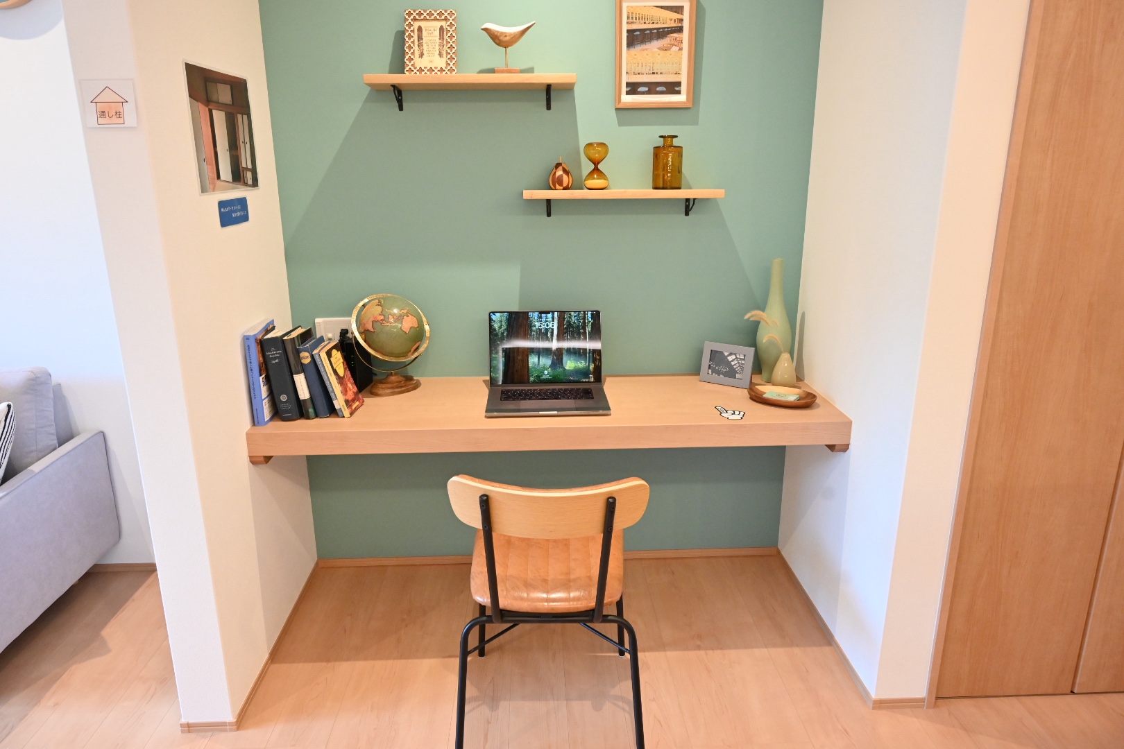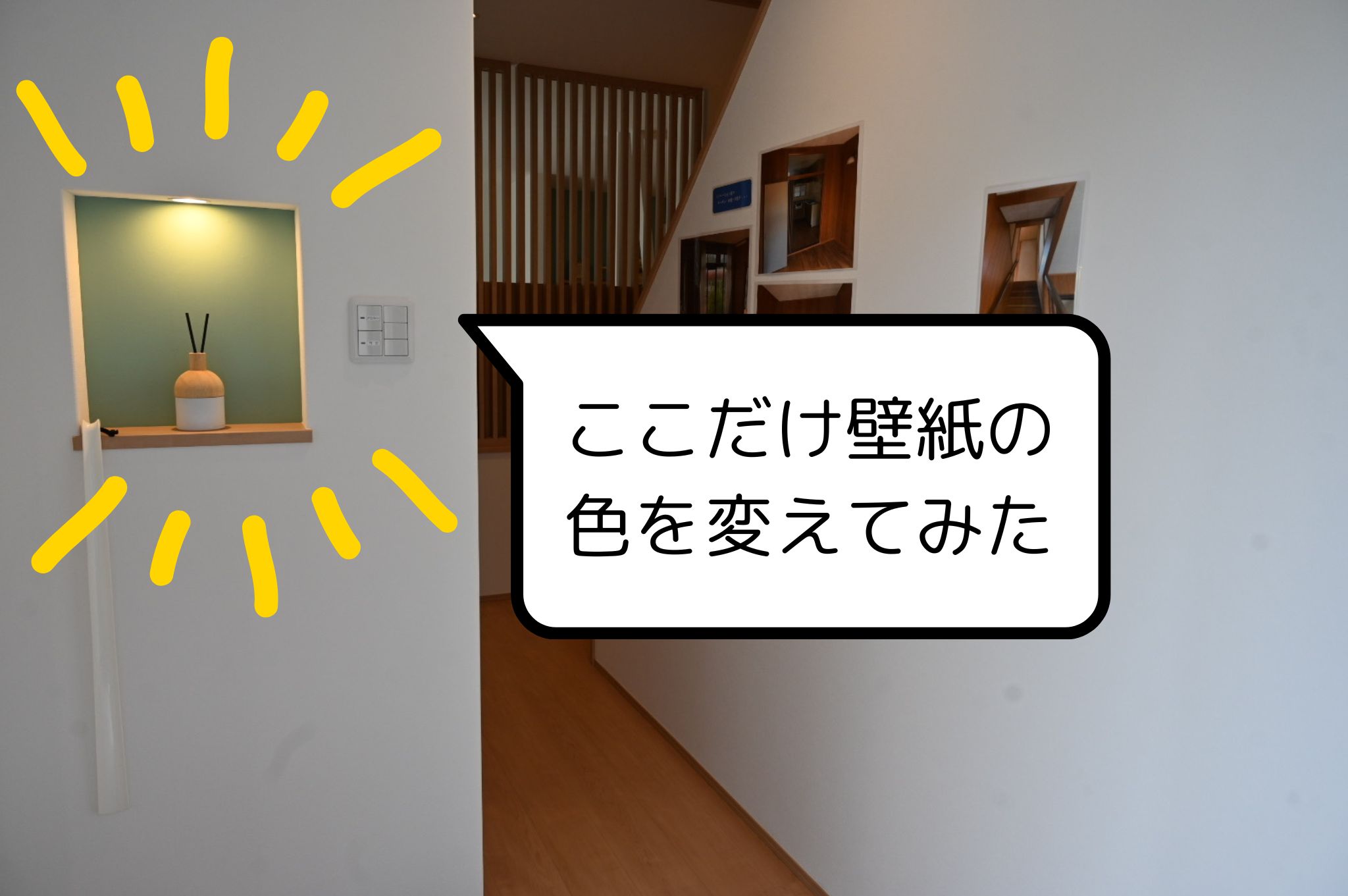例えば、玄関入ってすぐのこの照明のある所(ニッチ)、壁紙をそのまま白にされる方も多いですが、リビングにあるワークスペースと同じ色にしてみたり、ちょっとした遊び心を入れる事もできますね。