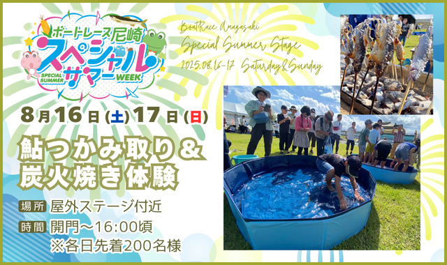 8/16(土)17(日)、ボートレース尼崎で、鮎つかみ取り&炭火焼き体験が開催されるみたい。