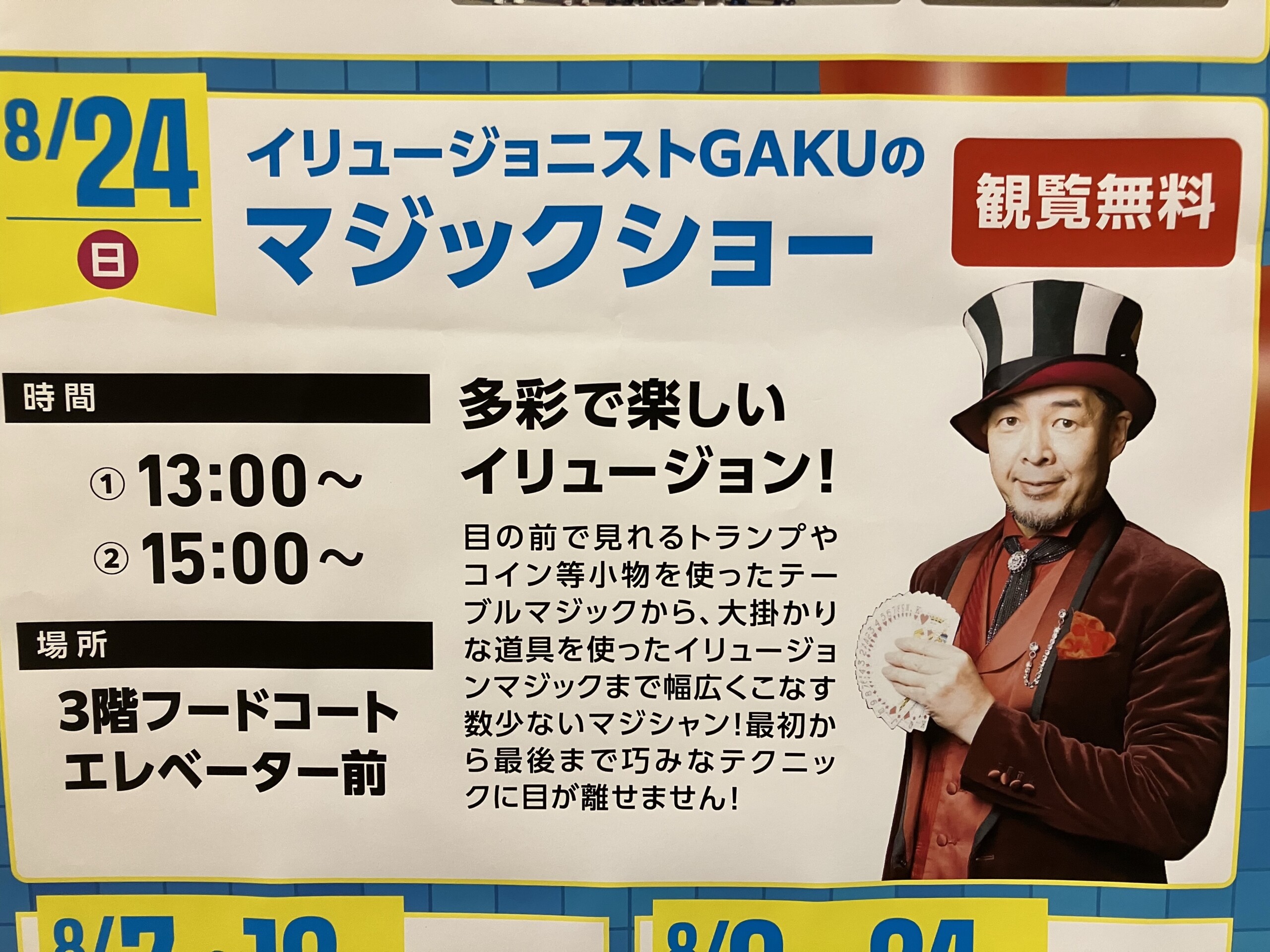 8月24日(日)、イオンモール猪名川で、イリュージョニストGAKUのマジックショーが開催されるようです!