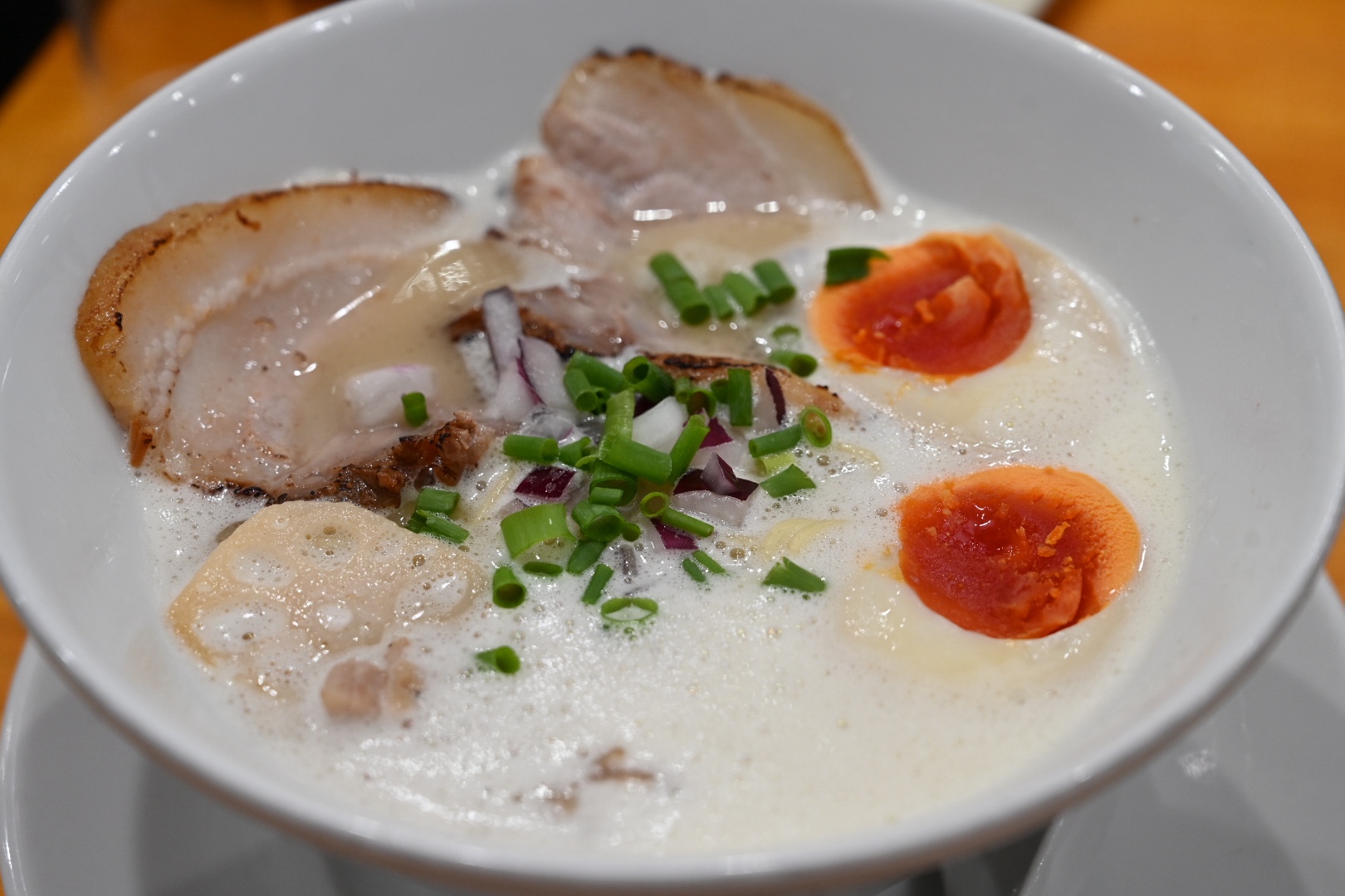 鹿児島県産の黒豚を使ったチャーシュー、食感にアクセントを加えるために鶏のセセリ、スープは鶏ガラを今までの2倍用いて濃厚にと、この日だけの為にこの鶏白湯を作ったとのこと。