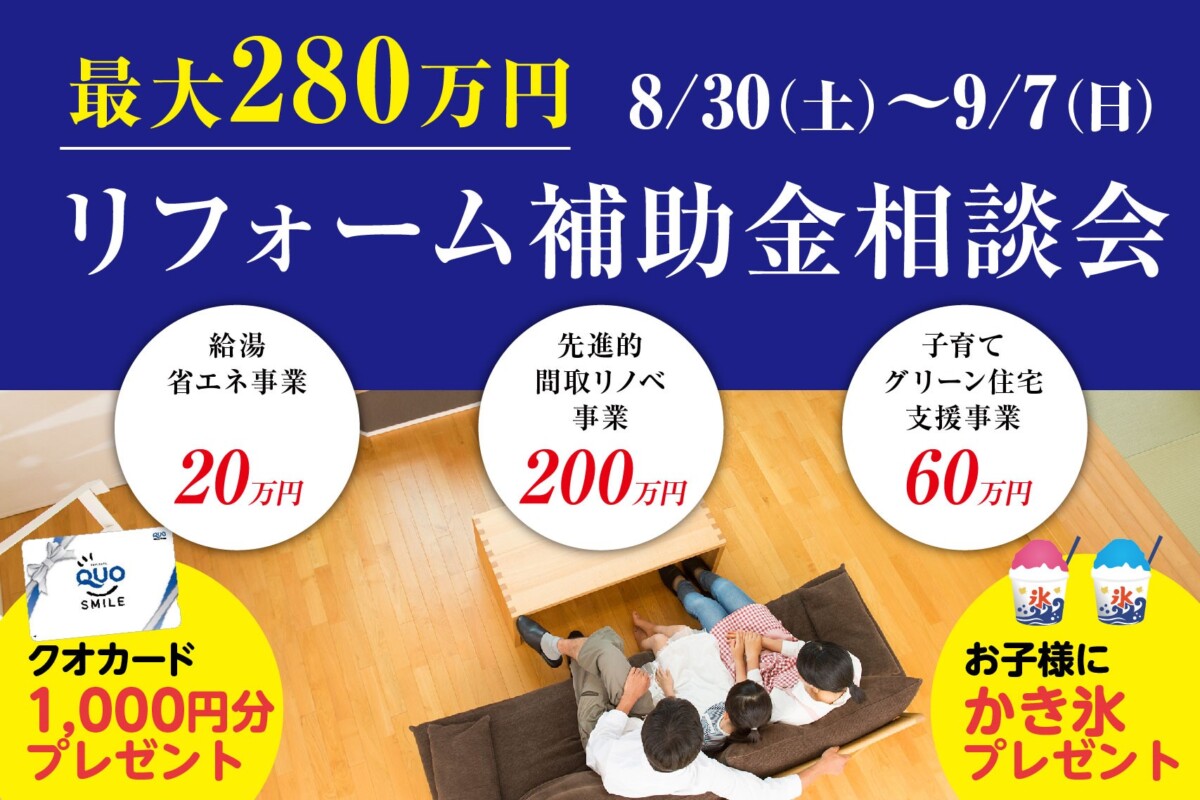 8/30(土)〜9/7(日)、最大280万円の補助金が使えるめっちゃお得なリフォーム補助金相談会が開催されるみたい。