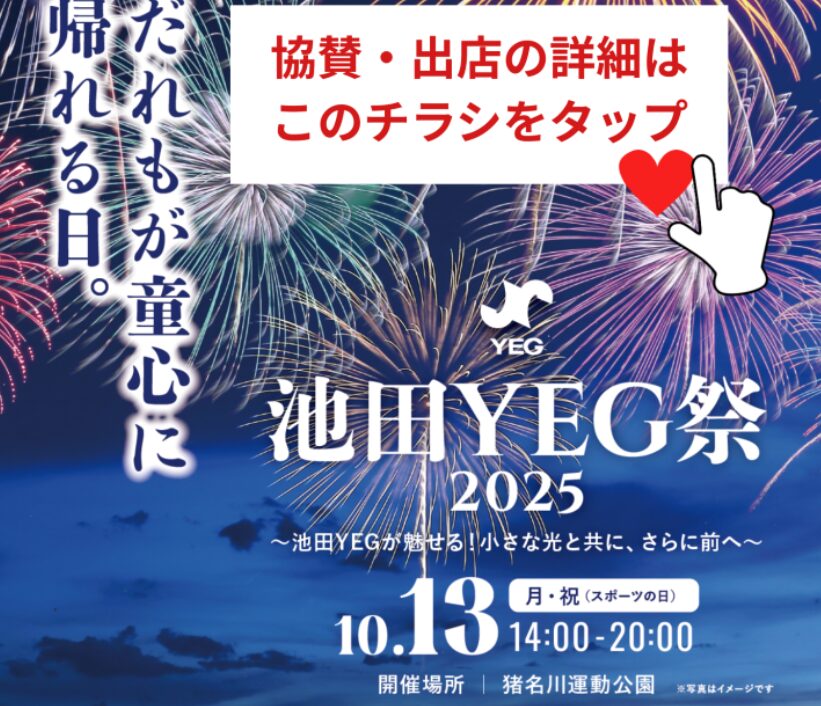 10/13(月祝)、猪名川河川敷で池田YEG祭っていう花火大会が開催されるようです!
