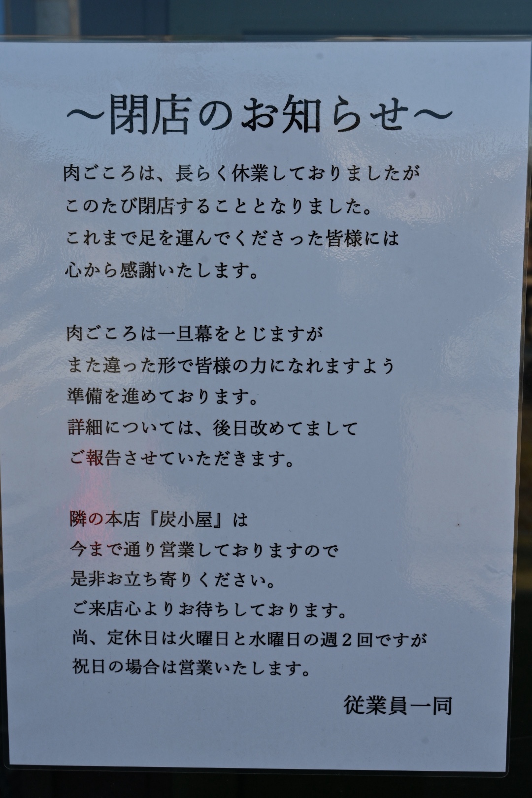 炭焼きステーキ肉ごころの閉店が告げられています。