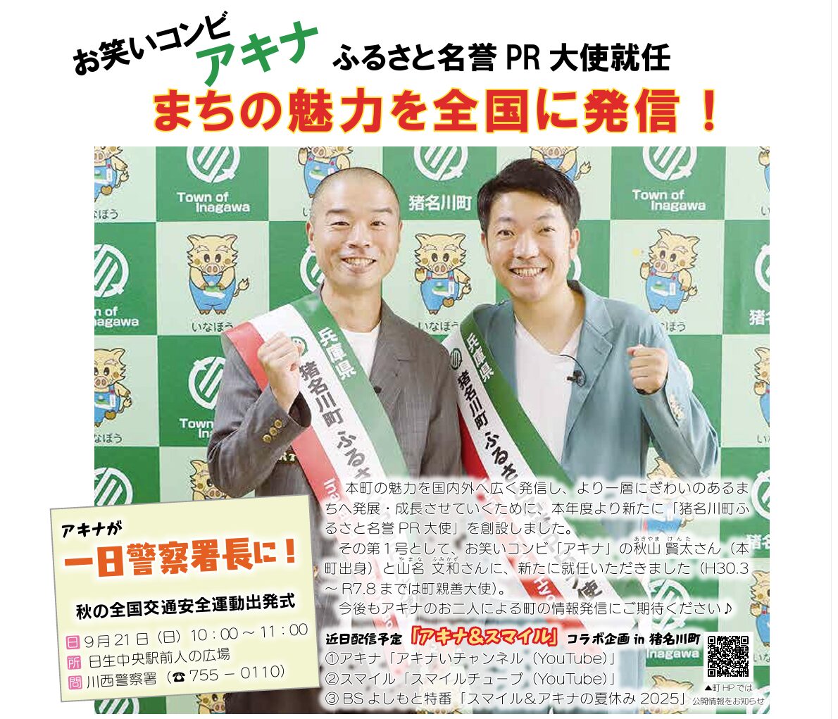 お笑い芸人のアキナの秋山賢太(写真右)は猪名川町出身で、その縁から猪名川町のふるさと名誉PR大使に就任。