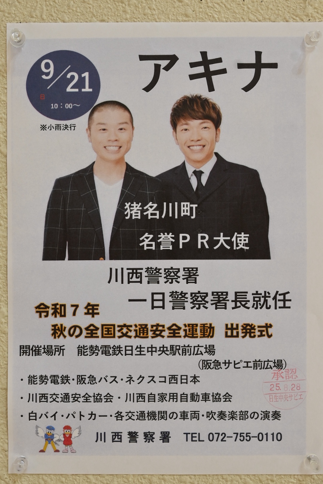 9/21(日)、日生中央駅前人の広場に、川西警察一日警察署長として滑り大魔神アキナがやってくるようです!