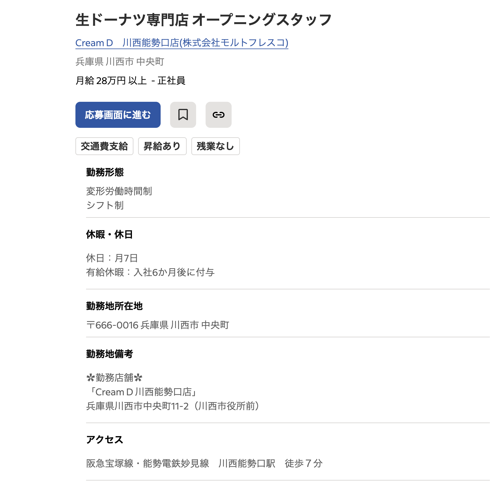 インディードの求人情報によると、「Cream D 川西能勢口店」という生ドーナツ専門店が12月にオープン予定との事。