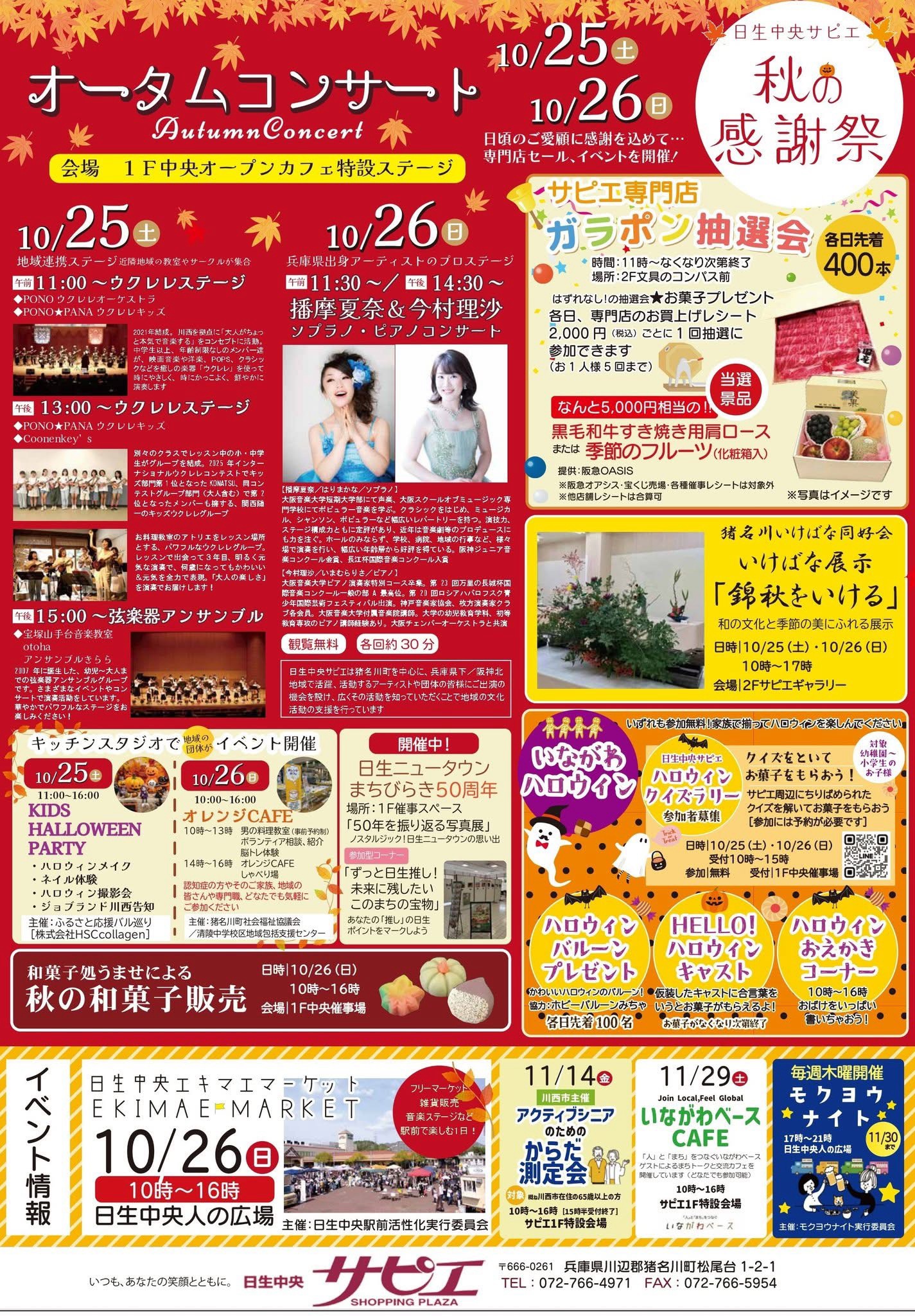 さらに、サピエでは10/25(土)26(日)の2日間、1F中央オープンカフェ特設ステージでウクレレやソプラノコンサートを開催。