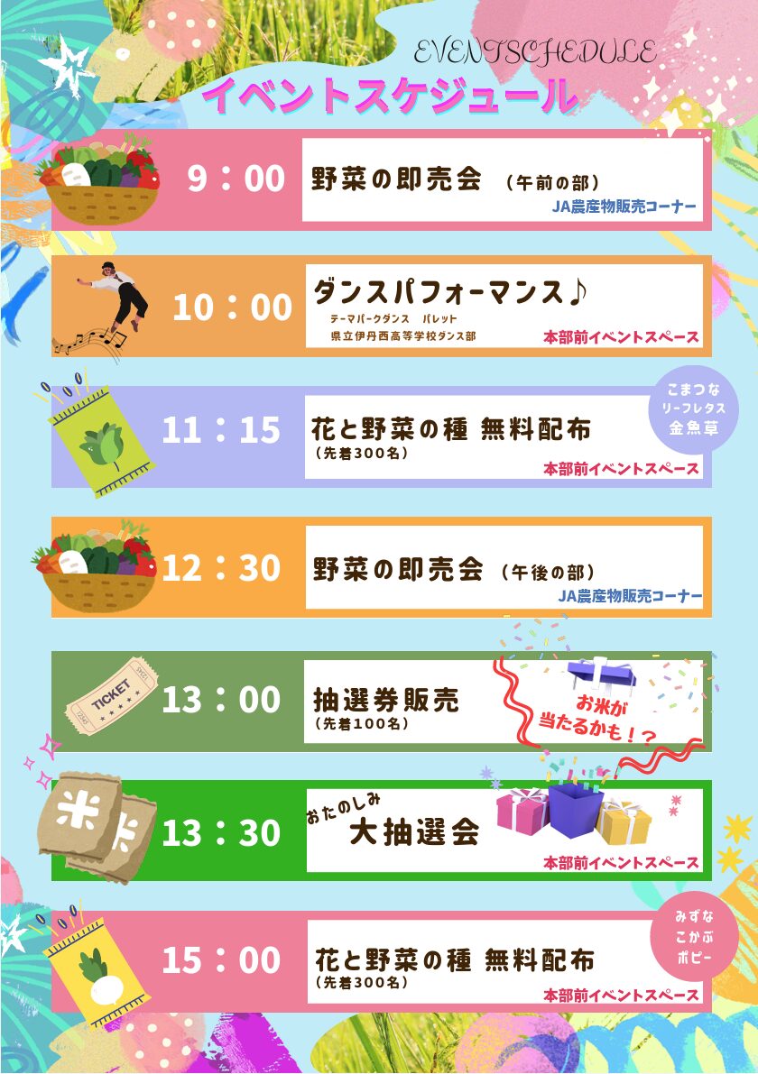 野菜の即売会、花と緑の販売、物産品販売、ダンスパフォーマンスにキッチンカーの出店にお楽しみ抽選会など、いろいろやってます。