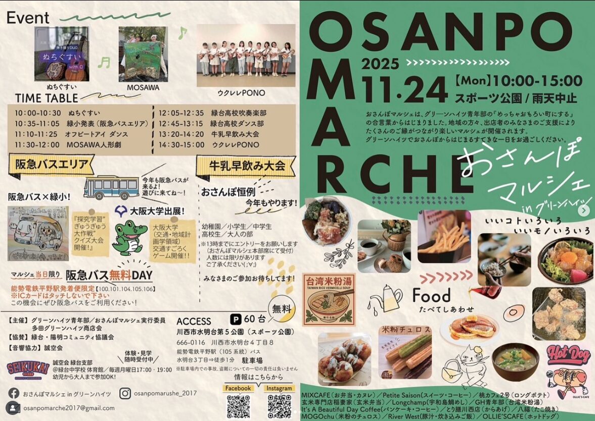 11/24(月祝)、グリーンハイツのスポーツ公園でおさんぽマルシェが開催されるようです!