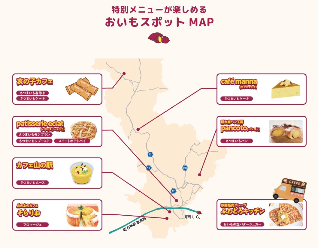 猪名川町で獲れたさつまいもを使った特別メニューが、町内の7店舗に期間限定で登場!というのが企画の概要。