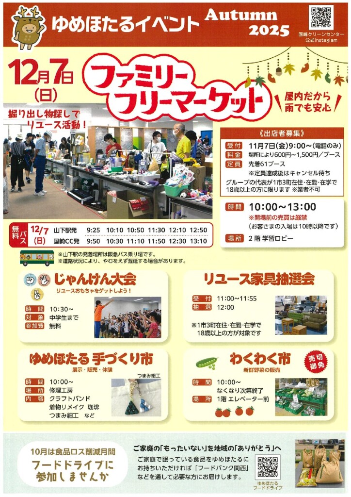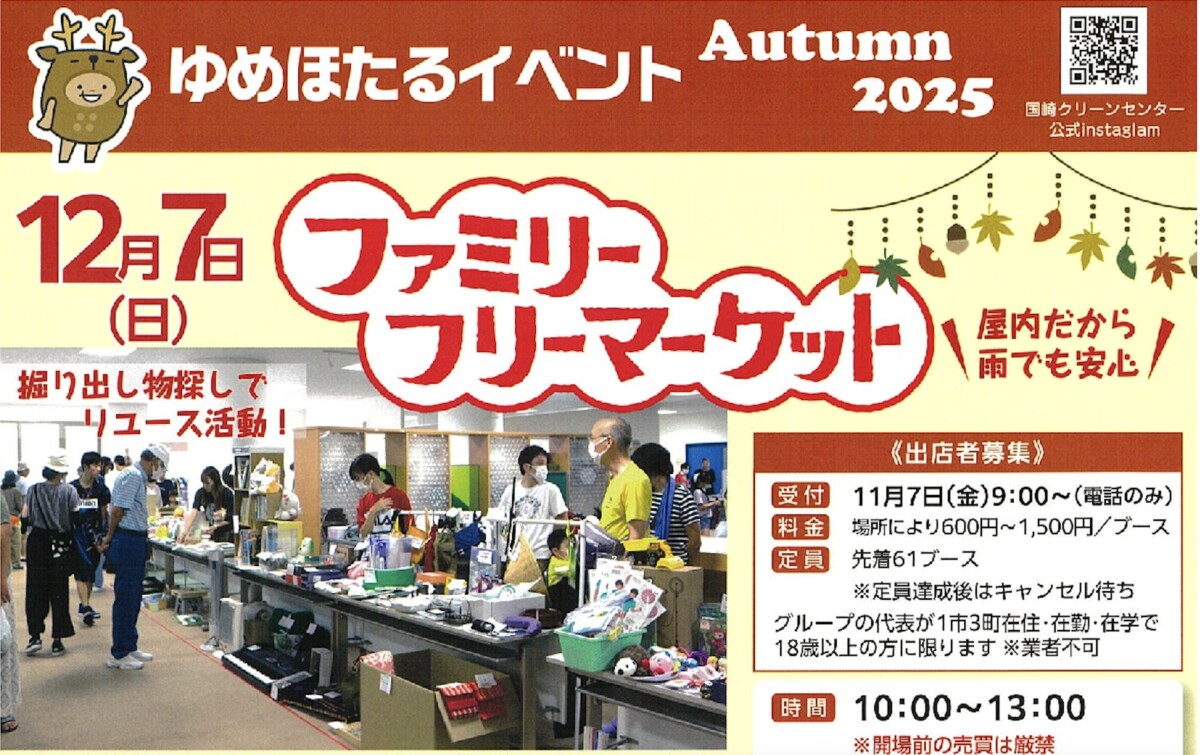 12/7(日)、国崎クリーンセンターゆめほたるでファミリーフリーマーケットが開催されるようです!