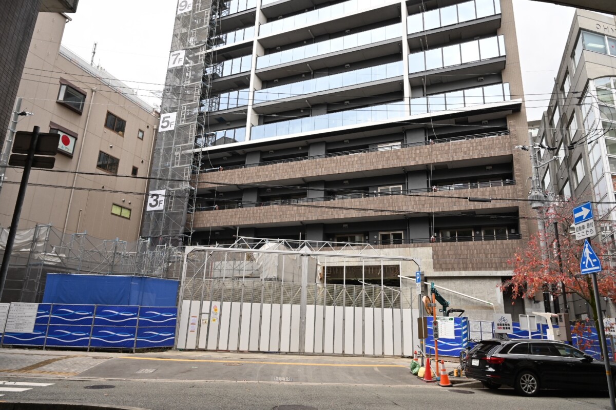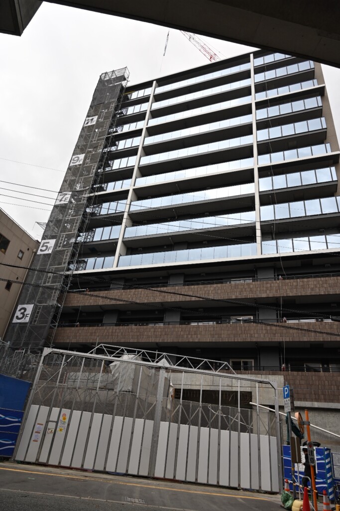 川西市中央町で建設しているマンション・ジオ阪急川西の外観がだいぶ出来上がってきた。