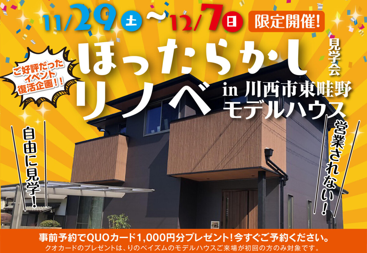11月29日(土)〜12月7日(日)、大好評のりのべイズムの「ほったらかし見学会リノベモデルハウス in 川西市東畦野」が再び開催されるようです!