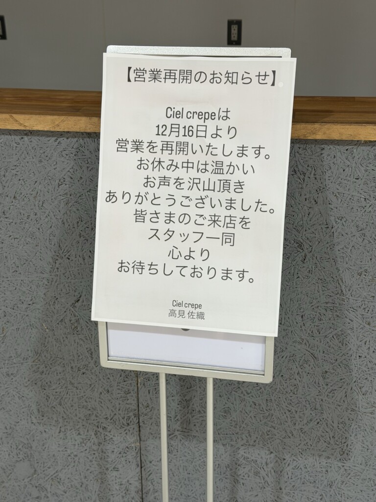 イオンモール猪名川3階のクレープ屋さんCiel crepeが12/16(火)から営業を再開するようです!